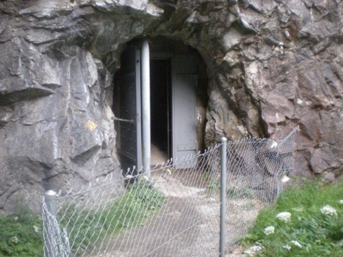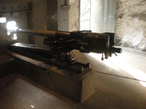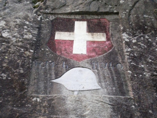 Und wie wenn der Kampf mit den Naturgewalten nicht schon reichen würde, können es die Menschen nicht lassen, sich gegenseitig zu bekämpfen. Im Bestreben, dies nicht zuzulassen, haben sich die Vorfahren mit der Natur verbündet und in diesen Hindernissen eine Festung angelegt. Unser Weg führt uns unmittelbar in sie hinein. Dass es nicht einfach ein Fußgängertunnel ist, wird gleich beim Eingang deutlich, wo immer noch eine Mitrailleuse aufgebaut ist.