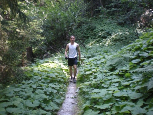 Am gleich anschließenden Verpflegungsposten trennen sich die Strecken für den Doppelmarathon und das Gondo Running. Für mich geht es rechts ab, für die Runner auf dem mir bekannten Weg zur Gondoschlucht. Ich werde nochmals darauf hingewiesen, dass auf den nächsten 600 Höhenmetern kein Verpflegungsposten zu finden und es deshalb ratsam ist, allfällige Flaschen noch aufzufüllen. Wegen dem Trinken habe ich keine Bedenken, das Nass strömt in solchen Mengen vom Himmel, doch einen weiteren Gelschub erachte ich als angebracht. Und dann geht es hinein in den Wald und an den Berg.