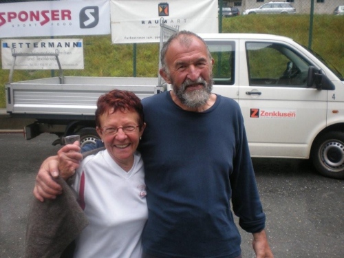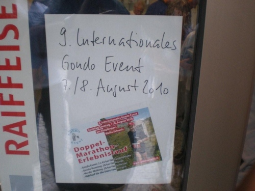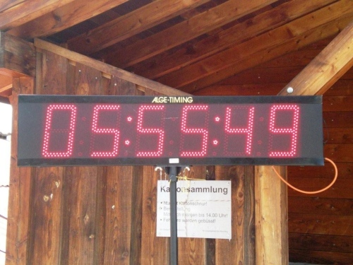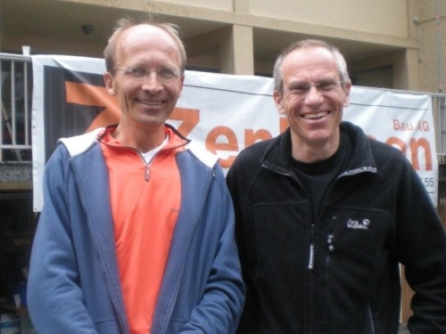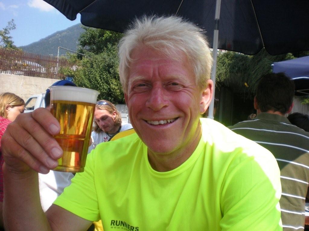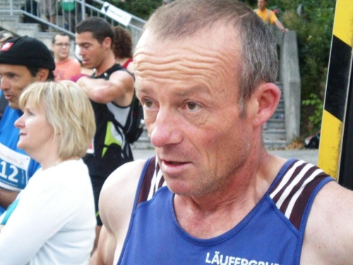Ein paar Sekunden zu früh überquere ich beim Schulhaus die Ziellinie, sonst hätte ich auf der Zeitanzeige lauter Fünfen gesehen. Lauter Einsen gibt es bis hierher für die Organisation (was in der Schweiz einer Sechs entspricht). So kann ich im Ziel ein paar Becher Flüssiges in mich hineinschütten, nebenan mein Gepäck holen und duschen gehen. Mit erstaunlich lockeren Beinen setze ich mich nachher in die Festwirtschaft und lasse mir eine Bratwurst und Pommes schmecken und stoße mit einem kühlen Bier mit Klaus Sobirey auf unseren ersten gemeinsamen Einsatz als Laufreporter an.