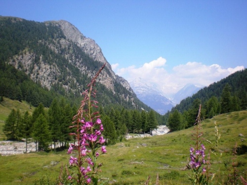 Je mehr wir uns Gabi nähern, desto weiter wird das Tal wieder und ein Blick ins Laggintal endet am Horizont bei den Gipfeln, hinten denen das Saastal mit seinen Viertausendern liegt. Wenn die Touristen auf der Simplonstraße sonst nicht viel bis gar nichts von unserem Laufabenteuer mitbekommen, so müssen sie sich hier gedulden, denn hier überqueren wir die Straße und haben Vortritt. Nach einem weiteren Stück Naturweg geht es dann bis Simplon-Dorf auf Asphalt weiter. Auf dem neu gestalteten, schlichten, schönen Dorfplatz steht ein weiterer Verpflegungsposten und dann geht es weiter über Egga, hinauf zur Passhöhe.