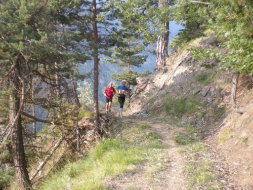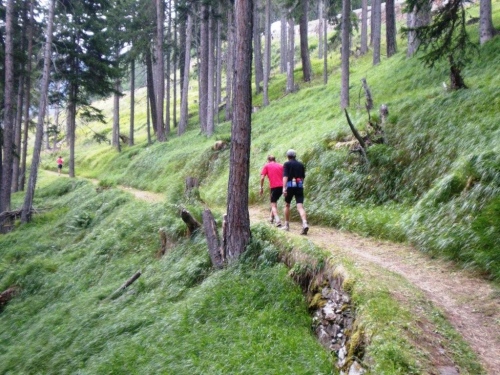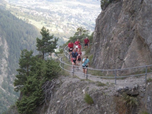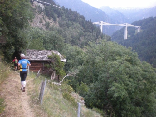 Es ist nicht nur die Steigung, die kurz nach dem Start beginnt, auch die morgendliche Wärme treibt mir innert kürzester Zeit Schweißperlen ins Gesicht. Bald sind wir wieder auf abenteuerlichen Wegen am Hang hoch über der Saltina, hinauf nach Schallberg, wo ich dankbar zwei Becher Iso entgegennehme und einen fotografierenden Kollegen von laufspass.com kennenlerne.