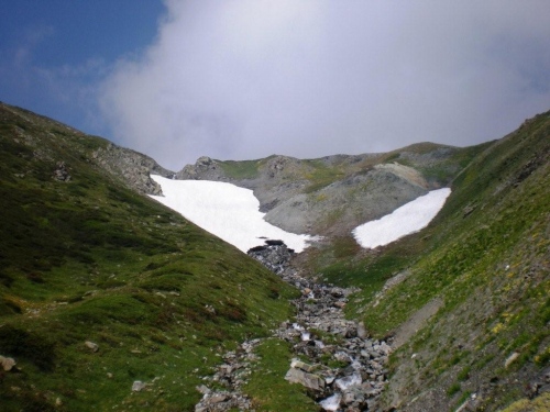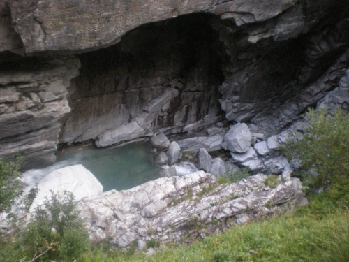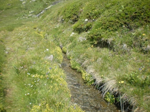 Obwohl das Tal im oberen Verlauf bei der grasreichen Nidristi Alp mit seinem Talgrund still und friedlich wirkt, sind überall Spuren zu sehen, die einen Eindruck geben, wie hier bei starken Niederschlägen das Wasser wüten kann. Der Weg führt uns nach dem Verpflegungsposten weiter der Gamsa entlang, bis sich diese tief in eine Schlucht frisst. Gegenüber den alten Beschreibungen hat sich hier nicht viel geändert: