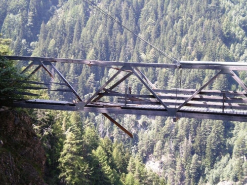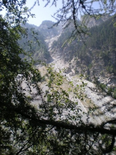 Diesen Weg zu unterhalten, muss eine Sisyphusarbeit sein. Die freigeschaufelte Passage durch einen Murgang und das zersplitterte Holz einer gesperrten Brücke zeugen davon. Wehe, wenn die Natur hier losgelassen wird.