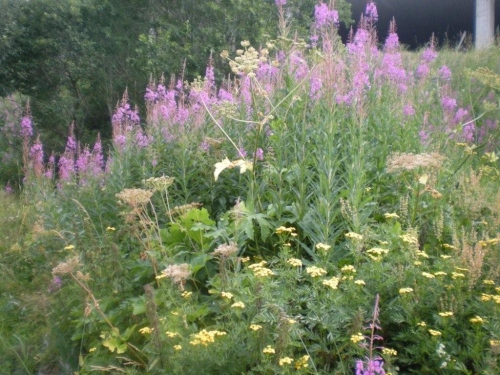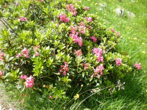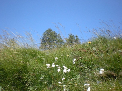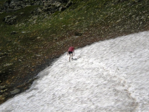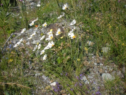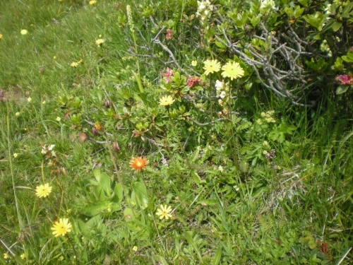 Der Bergpfad benötigt viel Aufmerksamkeit, aber der Blick auf den Boden wird mit einer farbenprächtigen Alpenflora links und rechts des Weges belohnt. Ich kann mich nicht erinnern, Anfang August noch einen solchen Bergfrühling erlebt zu haben. Verwunderlich ist es nicht, denn je höher wir kommen, desto näher sind wir an großen Schneefeldern und an Orten, wo das Gras noch nicht dazu gekommen ist, sein winterliches Braun abzustreifen. Diese leuchtende Farbensymphonie wird durch den stahlblauen Himmel über dem Horizont noch verstärkt.