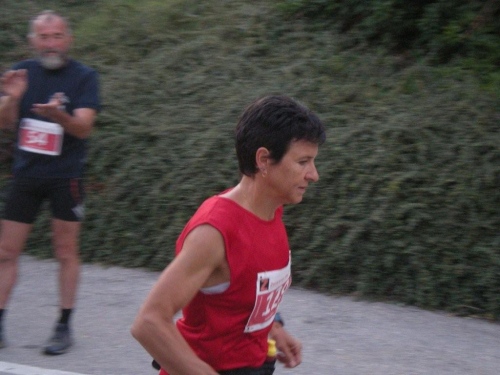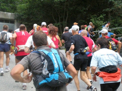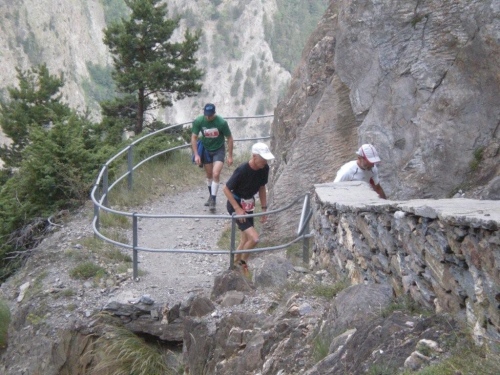 Irgendwann kommt von links die Originalstrecke steil auf die Straße hinunter und nach kurzer Zeit treffen wir auf den letzten Verpflegungsposten, wo die Helfer immer noch tapfer die Stellung halten und mir den letzten Becher wärmender Bouillon anbieten. Von hier an sind es noch vier Kilometer bis zum gestrigen Ausgangspunkt dieses Gewaltserlebnisses. Auf den ausgeschilderten letzten hundert Metern verzichte ich darauf, den Serpentinen der Straße zu folgen, da dies die verbleibende Strecke vermutlich vervierfachen würde, und nehme die Originalstrecke. Obwohl ich mich im Schritttempo die Natursteinstufen hinuntertaste, kann ich es nicht verhindern, dass es mich zum Abschluss noch auf den Allerwertesten setzt.