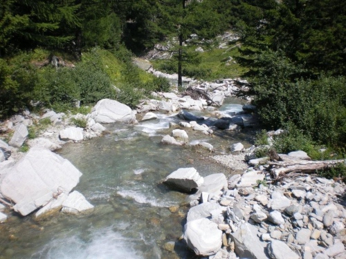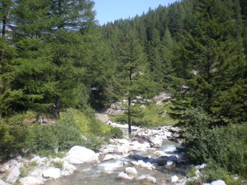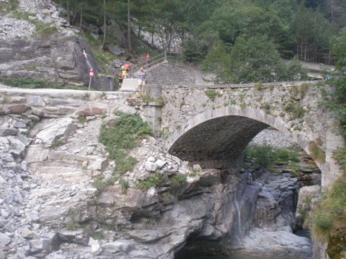 Wir sind noch nicht einmal richtig in die Gondoschlucht eingetaucht, das schwitze ich schon wie ein Bär. Sitzend und mit geschlossenen Augen würde ich mich eher in einem tunesischen Hammam als am Simplon wähnen. Der Blick auf die Felswände und Steine, hinab in den Fluss und hinüber zur Straße zeigen, dass ich an einem Ort in den Bergen bin, wo die Natur das Sagen hat und der Mensch sich zwar mit immer besseren Techniken vor ihr zu schützen, sie aber keinesfalls zu bändigen vermag.