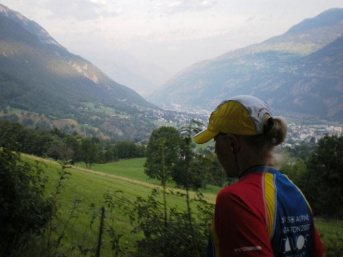 Imposant ist dann der Ausblick, der sich einem nach dem Verpflegungsposten bei Km 23 am höchsten Punkt der heutigen Marathonstrecke auftut. Ich lasse den Blick zum Rhonetal und zu den Berner Alpen schweifen und verzichte zugunsten der Aussicht darauf, mich auf den folgenden Kilometern vom Schub des Abstiegs hinunter ins Nanztal treiben zu lassen.