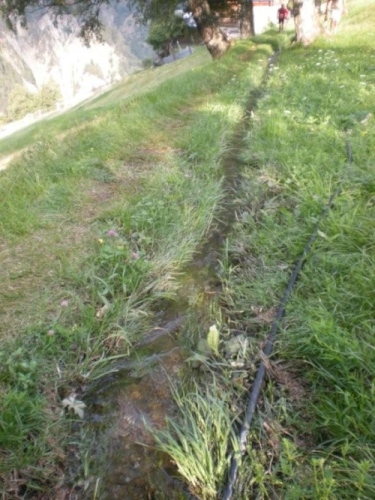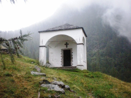 Der eigentliche Bach, der in einem Einschnitt nebenan ins Tal rauscht, ist kräftig angeschwollen und sein Wasser ist deutlich braun gefärbt. Bei einer kleinen Kapelle zücke ich nochmals die Kamera, die ich auf den vergangenen fast fünfzehn Kilometern vor dem Regen zu schützen versuchte. Da die Gewitterzelle in der Zwischenzeit abgezogen ist, verzichte ich darauf unterzustehen. Ich möchte in Bewegung bleiben um nicht doch noch zu frieren beginnen. Ein Indiz für die Stärke der Niederschläge sind die Rinder auf der Weide, die unter einer Gruppe von Lärchen Unterstand gesucht haben.