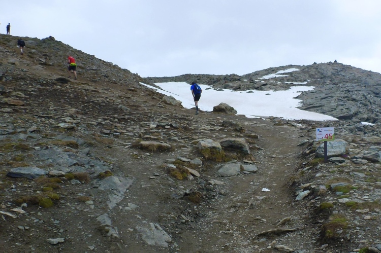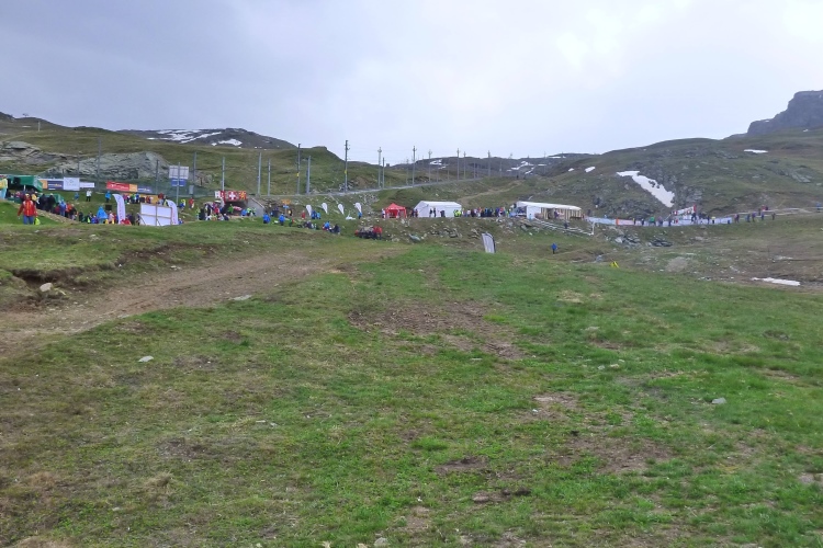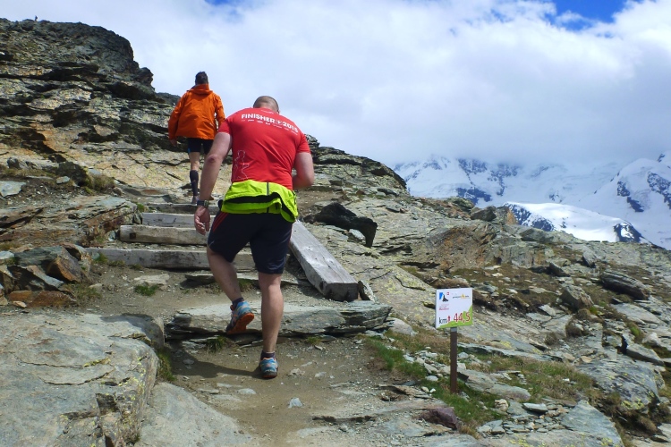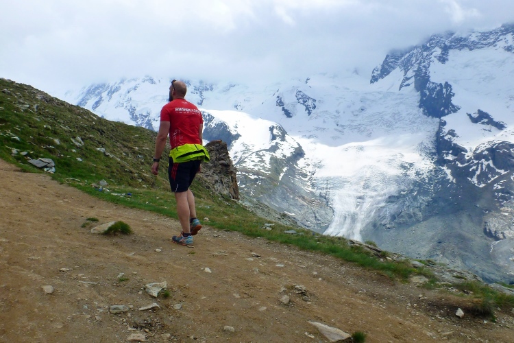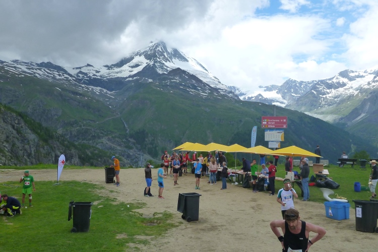 Ich drehe mich oft um. Das wäre der Punkt für fantastische Fotos mit Läufern, See und Matterhorn. Aber leider nicht heute. Zu viele Wolken umhüllen den Gipfel. Vielleicht hat der Chef bei der Spitzengruppe vor zwei Stunden mehr Glück gehabt. Wir kommen in ein Schottergebiet: Hier muss vor einigen Jahrzehnten noch der Findelgletscher gewesen sein. Seit den 1970er Jahren hat sich der heute 7,3 km lange Gletscher um 500 Meter zurückgezogen.