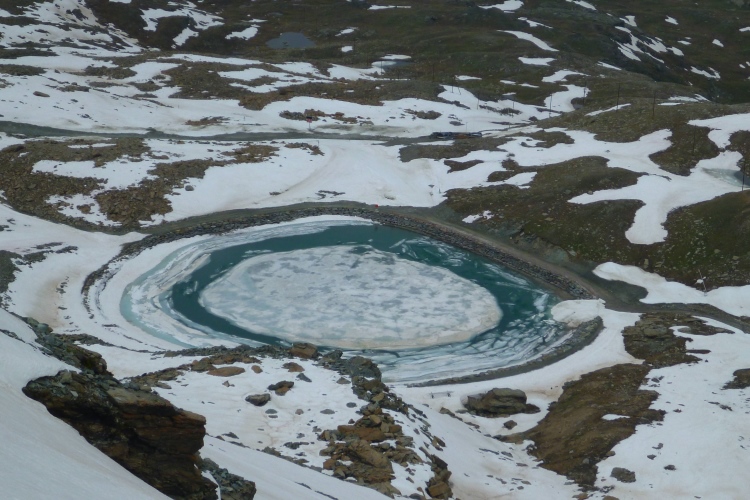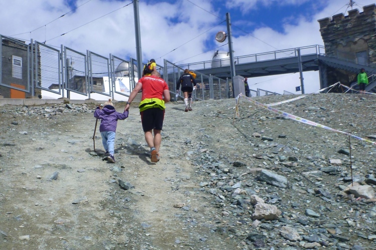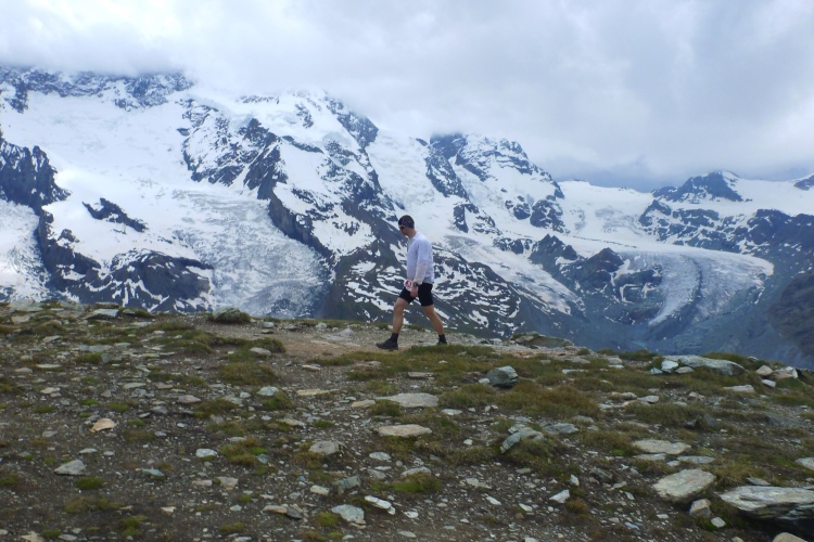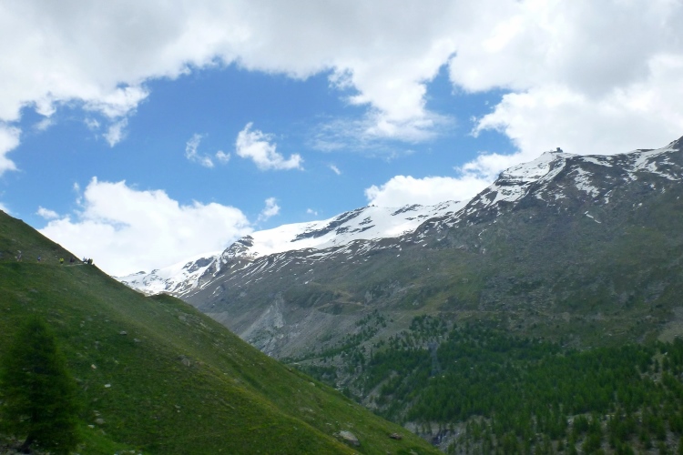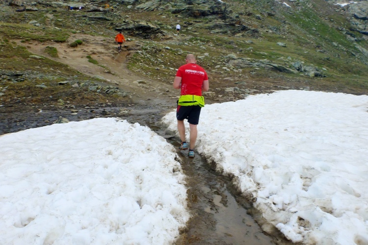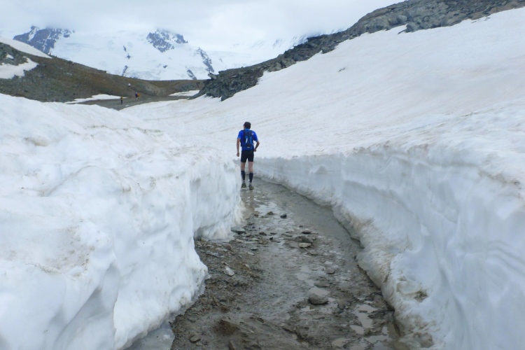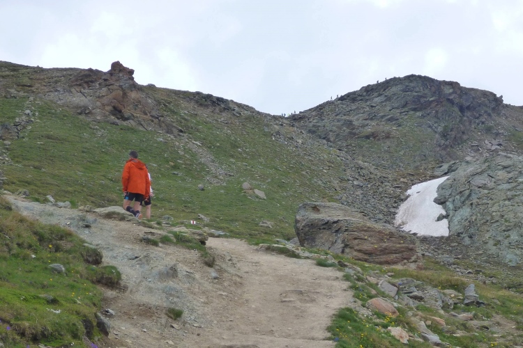 War ich an der Riffelbordgalerie doch ziemlich erschöpft, so beginnt es mir jetzt wirklich zu gefallen. Die hohen Berge mit den riesigen Gletschern rücken immer näher. An den steilen Stellen kann ich gut über die Felsstufen hochsteigen. Teilweise kommt man auf den Wegen durch die Wiesen auch wieder einmal im Laufschritt voran. Schneefelder wechseln sich mit Alpenblumen ab. Viele Pfiffe von aufmerksamen Murmeltieren sind zu hören. Japanische Wandergruppen, alle vernetzt mit Kopfhörer im Ohr, sind da weniger begeisterungsfähig. Der Blick Richtung Ziel ist immer wieder beeindruckend. Bunt gekleidete Läufer sind im Hang unterwegs. Trotzdem: Angst braucht man hier nicht zu bekommen. Der Weg ist nirgends ausgesetzt. Interessant, so eine breite zweispurige Eisenbahnstrecke auf einen Gipfel. Ziemlich matschig, aber beeindruckend, durch einen freigefrästen Weg durch den Schnee geht es für uns weiter. Fast bleibt mein Schuh im Matsch hängen.