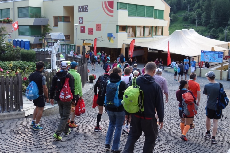 Auf halbem Weg nach Zermatt liegt St. Niklaus, Startpunkt des 15. Gornergrat Zermatt-Marathons und des Ultras. In der örtlichen Schule befindet sich die Ausgabe der Startunterlagen. Der Startbeutel, für die Ultra-Teilnehmer in rot, enthält u.a. ein Multifunktions-Halstuch im eigens kreierten Design. Der Feuerwehrmann am Parkplatz gibt mir den Tipp, das Auto gleich hier stehen zu lassen und mit der Bahn nach Zermatt weiterzufahren. So spare ich mir die Parkgebühr Täsch, von wo aus es mit dem Auto nicht mehr weiter geht.