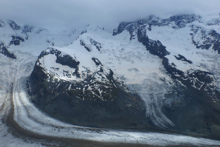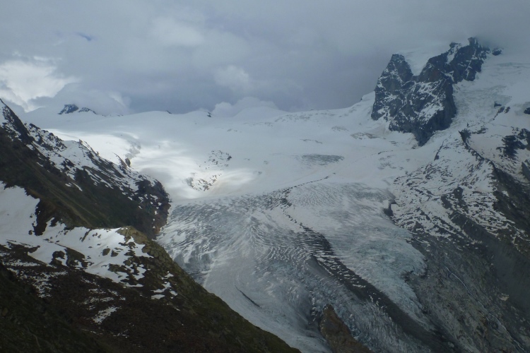 Judith und ich steigen noch zur Aussichtsplattform ganz oben mit Blick auf die vielen großen Gletscher. In der Dufourgruppe liegen der höchste Gipfel der Schweiz und Italiens in den Wolken und auch das Matterhorn verhüllt sich leider weitgehend.