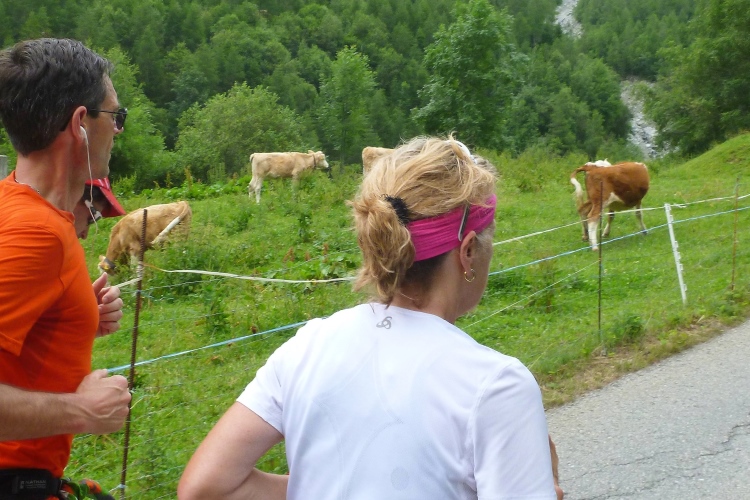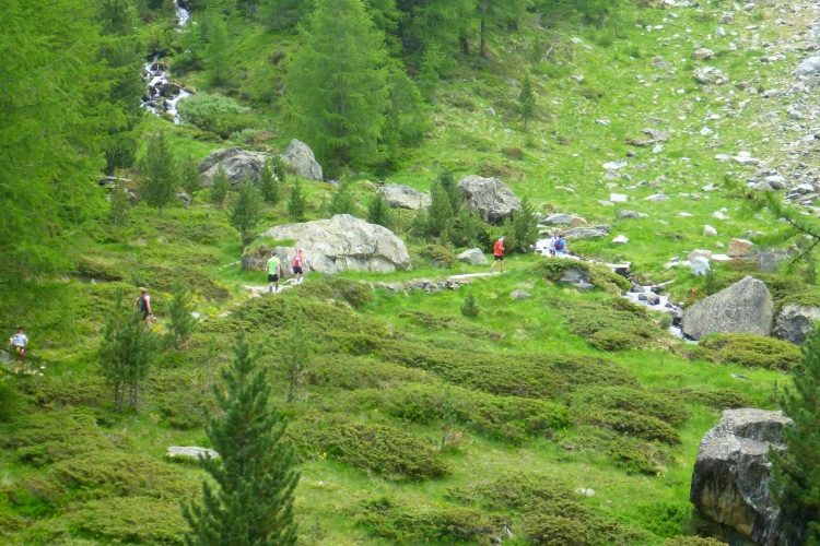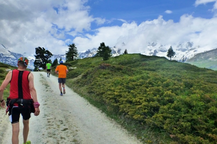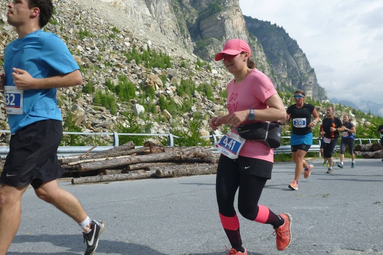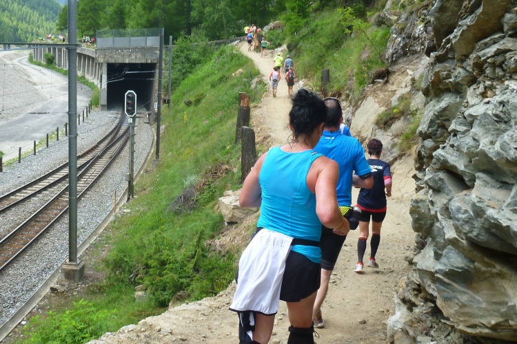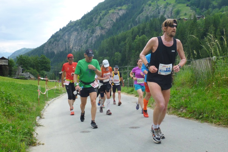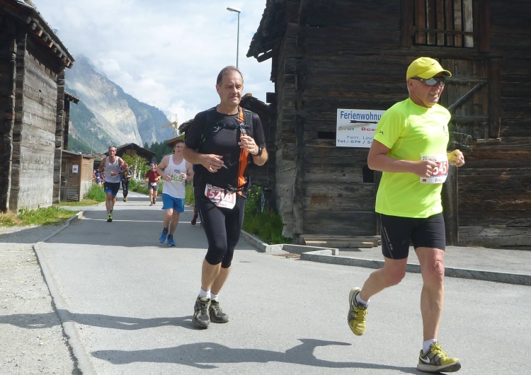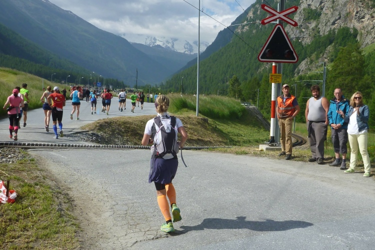 Ein freundliches schwarzes Kalb begrüßt uns bei Kilometer fünf. Kurz danach der erste Verpflegungsstand. Die Forststraße Eye wartet auf uns. Ab dem Haltepunkt Herbriggen geht es dann weiter auf einem Wanderweg. Soviel zu meiner Vermutung, dass es sich bis Zermatt um einen Straßenlauf handelt. Zwei imposante Kaltblüter stehen unbeeindruckt am Wegesrand. Nach neun Kilometern taucht auf der rechten Seite ein riesiger Schuttkegel auf. Der Bewuchs mit kleinen Nadelbäumen zeigt, dass der hierfür verantwortliche Bergsturz schon eine Weile zurückliegen muss: Im Frühjahr 1991 fielen in drei Etappen zwischen dem 18. April und dem 9. Mai  33 Mio m³ Gestein auf einen kleinen unbewohnten Weiler. Eine Staubschicht bedeckte das Tal und der aufgestaute Fluss Matter Vispa musste mit Pumpen über das Geröll geleitet werden. Wir laufen über eine „Umgehungsstraße“ am Geröll vorbei.