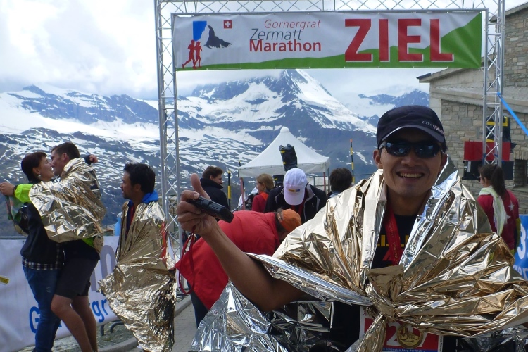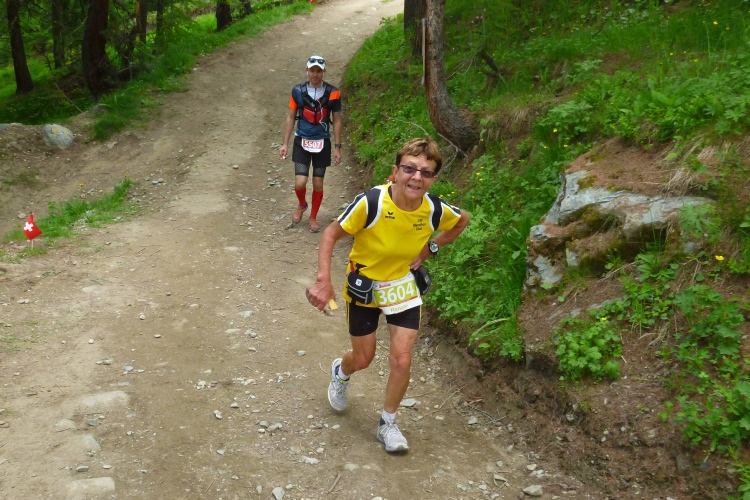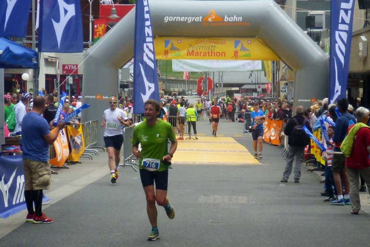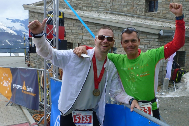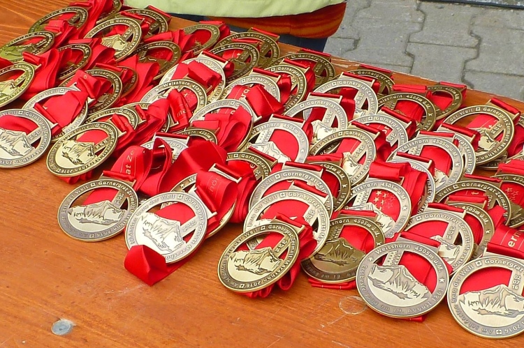Die Medaille, die in jedem Jahr anders gestaltet wird, zeigt diesmal das Weisshorn, mit 4505 m Höhe einer der 29 Viertausender aus der Gegend. Judith wird vom Sprecher als Zweite ihrer Altersklasse begrüßt. Markus aus dem Zug kommt kurz nach uns ins Ziel. Sein Spezl Manfred wartet schon seit 40 Minuten auf ihn. Als Vier-Stunden-Marathonläufer in der Ebene haben wir 7:03 Stunden für die 45,6 km mit +2.458 hm und -444 hm benötigt. An vier Stellen wurde die Zwischenzeit genommen und auf dem letzten Stück haben wir uns ganz gut geschlagen. Ein gewisser Ming aus Singapur läuft hinter uns ein. Wenn der wüsste, dass wir schon in seinem Heimatland den Marathon gelaufen sind. Dummerweise ist sein Fotoakku leer. Dafür merkt er sich die Trailrunning.de Internetadresse.