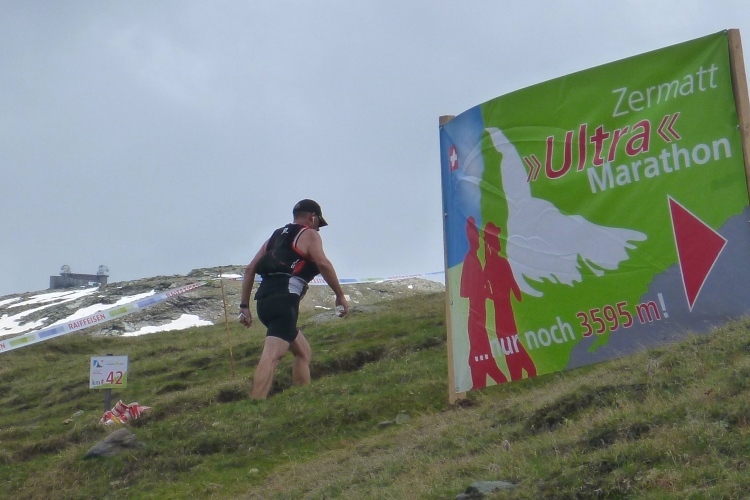 „Ouzo gibt’s erst im Ziel“ verkündet der Aufdruck auf dem Hemd einer vorbei marschierenden Läuferin. Wie mag die Spitzengruppe hier hinauf gerast sein? Irgendwie wird der Weg langsam flacher. Das Marathonziel Riffelberg liegt vor uns. Ich höre den Sprecher etwas von 6 Stunden erzählen. Dann erklingt das „Alli gliich“, er Gornergrat Zermatt Marathon Song. Auf 2.595 Höhenmetern trennen sich unsere Wege. Die Marathonis setzen zum Endspurt an und ich mache erst mal Pause. Das Marathonziel ist 7 Stunden offen, das Ultraziel 8 Stunden. Das beschert Läufern, die in der Ebene fünf Stunden für 42 km brauchen, recht wenig Spielraum für den Ultra. Aber zur Not kann man hier auf den Marathon umsteigen. Viele Schweizer Fähnchen markieren den richtigen Weg. Auch kilometerlange Bänder mit Raiffeisenbank-Aufdruck wurden gespannt. Verlaufen kann man sich da wirklich nicht.