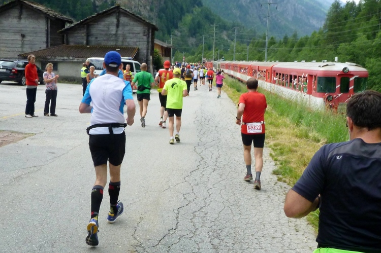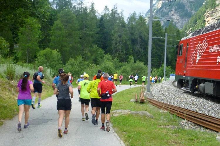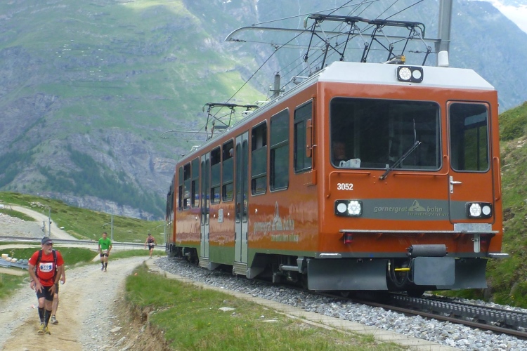 Die Startnummer gilt von Freitag bis Sonntag als Fahrschein. Alle 30 Minuten fährt ein Zug Richtung Zermatt und so können wir mit vielen anderen Läufern schon mal die erste Streckenhälfte „erfahren“. An einigen Stellen geht es so steil hoch, dass Zahnradtechnik erforderlich ist. 12.000 Touristen kamen in den 1880er Jahren schon nach Zermatt, sodass diese Bahn dringend notwendig war. Die Startnummer enthält zwei Chips: Einmal für die Zeitnahme und eine eingeklebte Chipkarte für die Drehkreuze der Bergbahnen des Hauptsponsors Gornergratbahn. Auch die kann man drei Tage lang kostenlos benutzen. Für Begleitpersonen gibt es den Zwei-Tagespass für 200,- CHF. Da wäre es also finanziell interessanter, auch mitzulaufen.