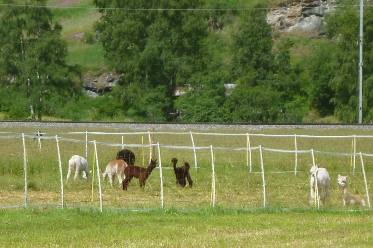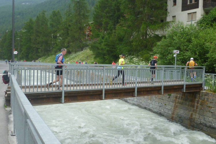 In Randa hat uns die Zivilisation wieder. Verpflegung vor dem Feuerwehrhaus und dann weiter nach Täsch. Dort geht es an der Kirche richtig zur Sache: Die Guggenmusi „Wäsmali-Chatze“ spielt auf. Und das direkt neben dem Friedhof... Täsch markiert seit 1931 das Ende der Automobilkultur. Wer hier mit dem eigenen Wagen weiter will, braucht eine Sondergenehmigung. Alle anderen fahren ins Parkhaus und dann mit den Pendelzügen nach Zermatt. Einige Lamas und/oder Alpakas recken ihre langen Hälse und schauen uns zu. Hinter der nächsten Kurve wird es wieder steiler und dann taucht ein großer Straßentunnel auf. Vier Kilometer Trail warten danach auf uns. Über eine Holzbrücke queren wir den tiefen Einschnitt der Matter Vispa. Weiter auf der Lawinenverbauung der Eisenbahn durchs Tal.