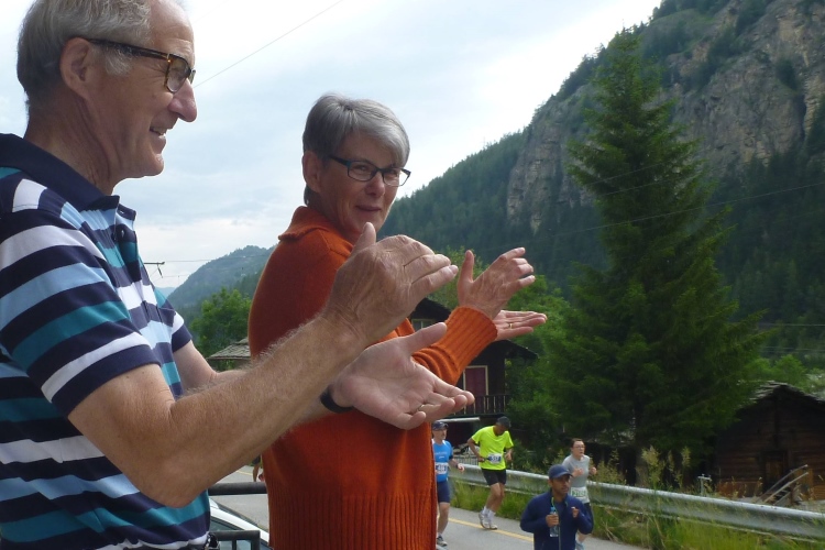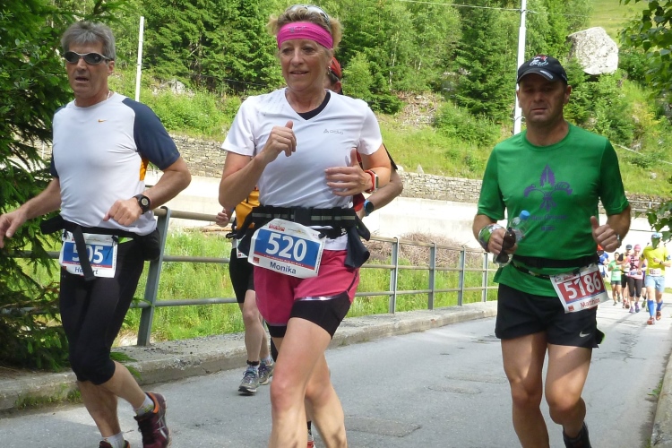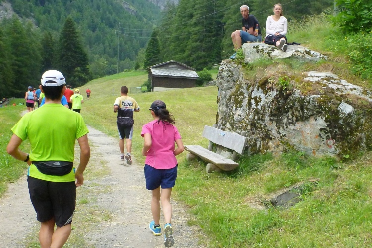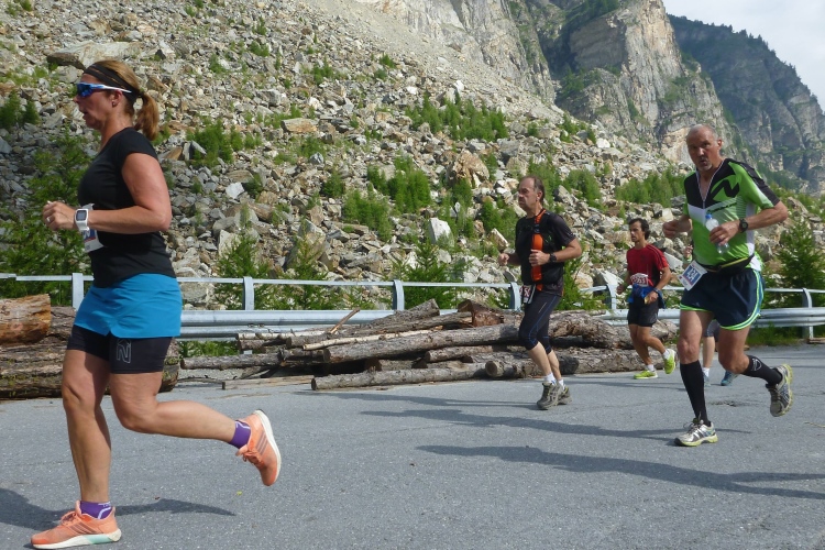Das traditionelle Walserhaus war sehr einfach gehalten, mit kleinen Fenstern und einer geringen Raumhöhe von 1,60 m, damit im Winter die Wärme lange im Zimmer blieb. Und die Winter sollen hier recht kalt sein. Für uns hat es heute hier läuferfreundliche 16 Grad. Auf einer kurzen Begegnungsstrecke sehe ich Manfred, der damit schon 1,5 km voraus liegt. „Uff, an den Anstieg hatte ich gar nicht mehr gedacht“, höre ich eine Läuferin stöhnen. Läppische 20 Höhenmeter und wir kommen an der Seilbahn vorbei, die uns über mehrere Etappen bis in das Sommerskigebiet auf 3.900 Metern Höhe bringen würde, Skischaukel ins italienische Breuil-Cervinia inklusive.