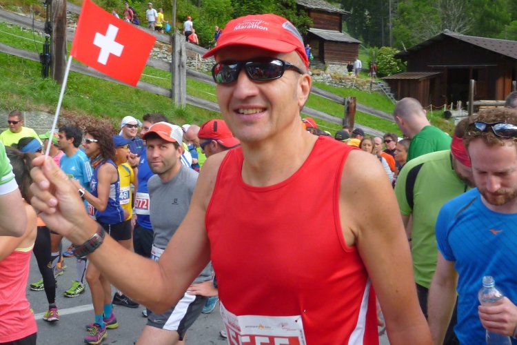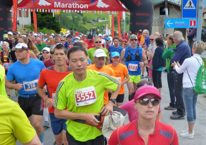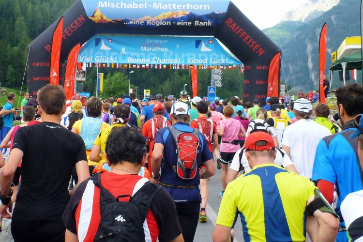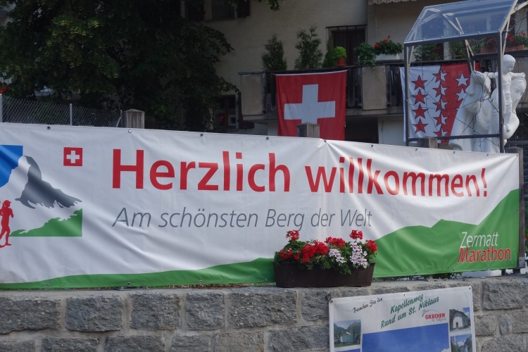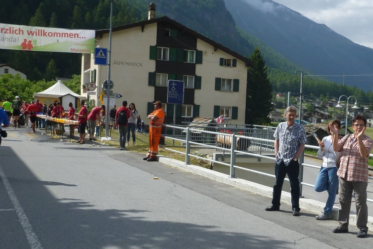 Zermatt ist ein Schweizer Bilderbuchdorf und hat im Winter Hochkonjunktur. Jetzt im Sommer sind viele Asiaten in der Stadt und die Preise für Hotelzimmer etwas moderater. Wir beziehen Quartier und brechen gleich zu einem Rundgang durch den Ort auf. Auf dem Bahnhofsplatz ist ein Festzelt aufgebaut, in dem die Pasta-Party stattfindet, gesponsert von Lonza, einem weltweit agierenden Zulieferer für Pharma-, Biotech- und Spezialchemie-Märkte. Für 5 CHF gibt es eine große Portion Nudeln und ein alkoholfreies Getränk. Den Gutschein für einen Nachschlag heben wir uns für Samstag auf.