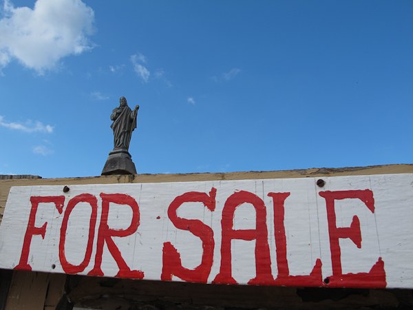 Weiter laufen wir auf bröseligen alten Terrassenfeldern im Landesinnern. Vorbei an brachliegenden Trockenmauerterrassen führen Steintreppen, die eher Klettersteige als Stufen sind, hinauf. Zwischen Kaktusfeigen und Palmen befindet ein verrosteter Zaun; auf dem Tor platzt die bunte Farbe ab und darüber hängt ein verwittertes Holzschild: „Zu verkaufen“.