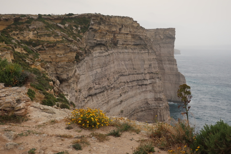 Da der Weg entlang der Klippen nicht durchgängig öffentlich zugänglich ist, müssen wir vor dem wunderbar gelegenen Fünf-Sterne-Resort von Ta'Cenc den Weg landeinwärts durch das Dörflein Sannat nehmen. Wer es nicht allzu eilig hat, dem sei genau an der Stelle, wo der Weg abbiegt, empfohlen, einen außerplanmäßigen Abstecher von 50 Metern nach links in Richtung Klippen zu machen: Als Belohnung winkt ein wahres „Wow“-Erlebnis beim schwindelerregenden Blick in die Tiefe.
