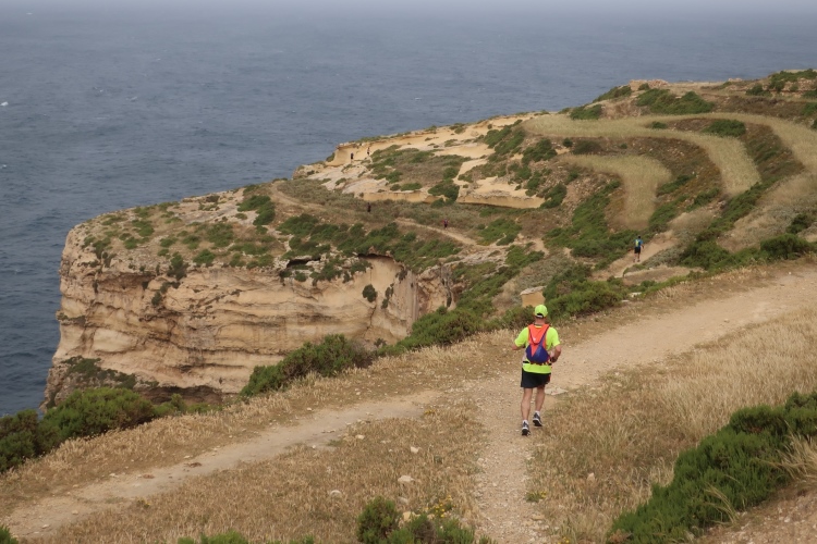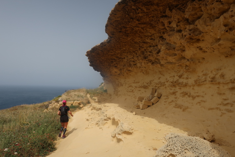 Und hier nun – endlich – wird der Lauf entlang der Klippen auch optisch zum besonderen Spektakel. Im stetigen Auf und Ab windet sich der felsige Pfad bisweilen nur wenige Meter vom Abgrund entfernt dahin. Nicht ganz so hoch wie in Ta' Cent, aber nicht minder spektakulär senken sich die wild zerklüfteten Felswände in die Tiefe. Aufpassen muss man, dass man im Bann der wind- und wellenumtosten Szenerie nicht das profilierte Gelände vergisst. Immer neue fantastische Bilder tauchen vor mir auf. Ich kann nur sagen: Das ist „trailrunners paradise“. Über Kilometer geht es in dieser Weise dahin.