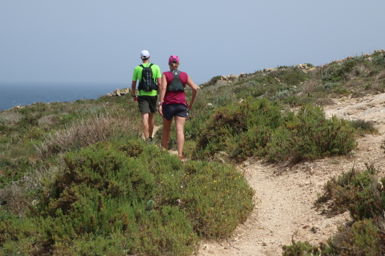 Auf unserer Laufstrecke erleben wir Marsalforn aber letztlich nur als Momentaufnahme. Schnell ist das jenseitige Ende der Promenade erreicht und ein weiterer kräftiger Anstieg entführt uns aus der Zivilisation wieder in die Höhe und die Einsamkeit. Die Kulisse ist nun eine ganz andere. Weicher und grüner sind die Hügel, die hier dem Meer entsteigen. Auf einem schmalen Höhenweg folgen wir dem Auf und Ab der Hügelwellen.