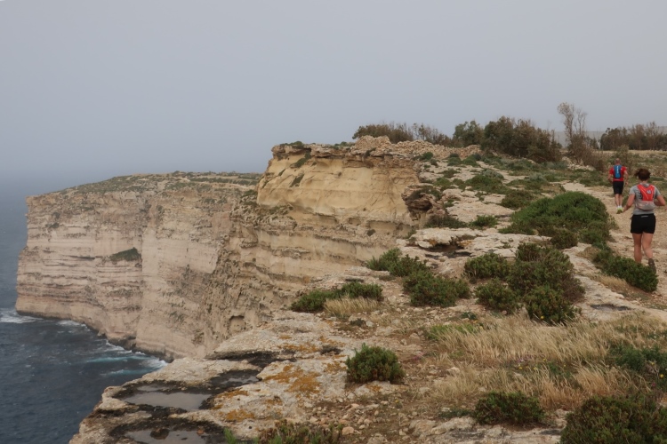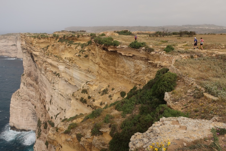 Und dann sind sie auf einmal am Horizont zu sehen: Die Klippen von Ta' Cenc. 145 Meter stürzen sie senkrecht ins Meer hinab, dramatischer und steiler als an jeder anderen Stelle auf dem maltesischen Archipel. Kein Schild warnt hier, kein Zaun hält zurück, es ist die schlichte menschliche Vernunft angesagt, sich der Abbruchkante nicht allzu wagemutig zu nähern. Für uns Läufer ergibt sich daraus ohnehin kein Problem. Ganz im Gegenteil: Unser Kurs hält einem felsigen Pfad folgend so viel Abstand zu den Klippen, dass wir sie gar nicht weiter zu sehen bekommen.