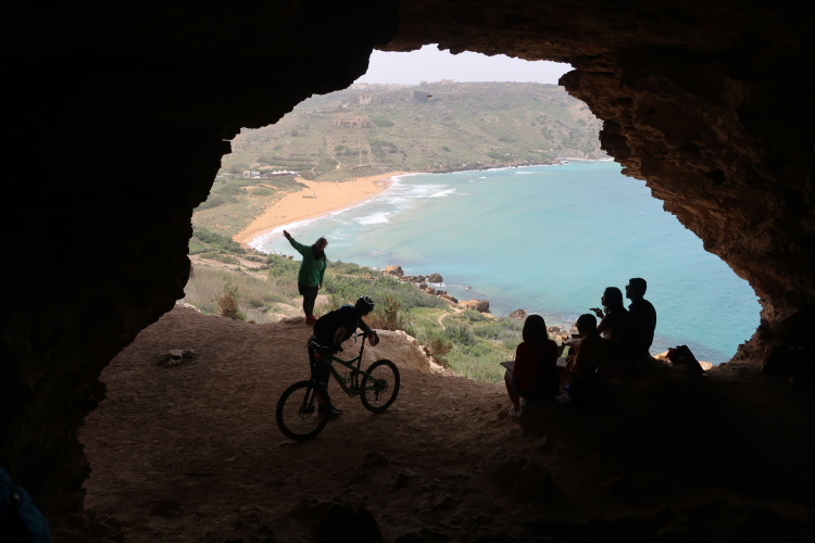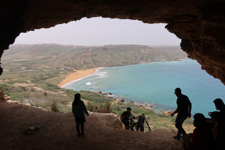 Der Länge nach laufen wir den weichen Sandstrand ab, verfolgt von den Blicken der relativ raren Badegäste. Am anderen Ende des Strandes angekommen erwartet uns der nächste Anstieg. Dieser zeichnet sich durch zwei Dinge aus: Er ist besonders schön ebenso wie besonders steil. Von der Natur dicht eingewachsen ist der steinige, oft gestufte Pfad. Selbst die Mountainbiker müssen hier ihr Rad schultern. Von hoch oben dringen Stimmen zu mir herab, die ich erst gar nicht so recht einordnen kann. Schritt für Schritt drücke ich mich in der stehenden Hitze nach oben. Richtig klein komme ich mir vor angesichts der Opuntien-Ungetüme, die den Weg säumen. Die anfeuernden Stimmen kommen näher und auf einmal trete ich ein in den kühlen Schatten einer geräumigen, halbmondförmigen Grotte. Grandios ist von hier der Ausblick in die Bay, vor allem in Kombination mit dem Rahmen, den der Rundbogen der Höhle bildet. Kein Wunder ist, dass dieses Bild so manchen Werbeprospekt für Gozo ziert.