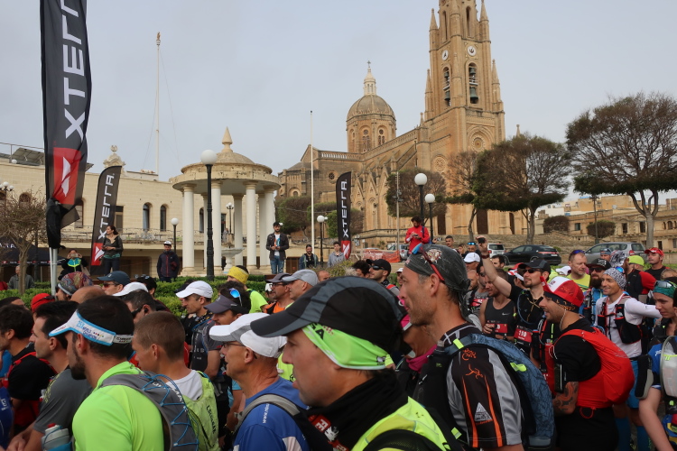 Gestartet wird im beschaulichen Dorf Għajnsielem oberhalb des Fährhafens von Mgarr. Windig und kühl ist es, als ich um kurz nach 7 Uhr aus dem Nachbarort Nadur anreise. Die Wolken am Himmel lassen alle Wetteroptionen offen. Durchschnittlich 300 Sonnentage hat Gozo im Jahr, sodass ich die Hoffnung nicht aufgebe, dass auch der heutige Tag in diese Statisktik fällt. Mehr und mehr Läufer trudeln auf dem Bethlehem Square zu Füßen der spitztürmigen Pfarrkirche ein. Ein Massenfeld ist es nicht: Für den 50k gemeldet sind 128 Läufer, aber aus immerhin 23 Nationen, also ein recht bunter Haufen. Noch einmal so viele Teilnehmer sind es, die sich für den auf dem letzten Teilstück ausgetragenen Halbmarathon oder die Mountainbike-Variante des 50ers entschieden haben. Doch die starten später.