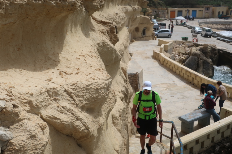 Eine mit bunten Toren durchsetzte gelbe Felswand hebt sich malerisch am Horizont ab. Wir erreichen die kleine, auch mit dem Auto erreichbare Bucht von Dahlet Qorrot. Auf der Hafenmole ist ein letzter Verpflegungsstand eingerichtet, den man bis 16 Uhr passiert haben muss, sonst fällt man aus der Wertung.