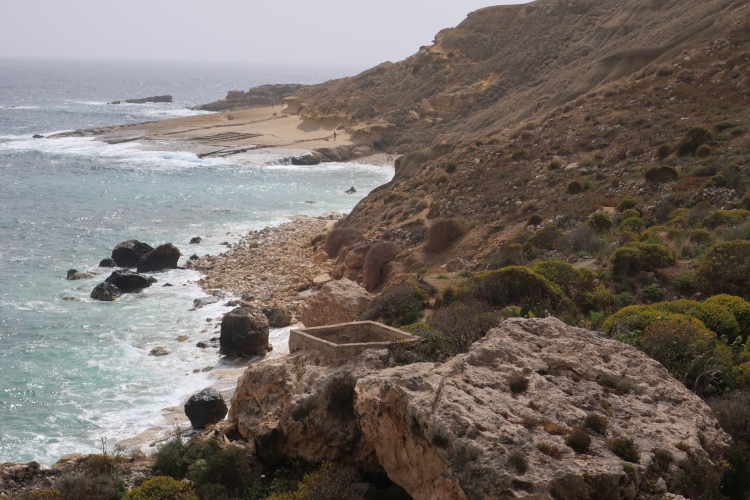 Im Abgalopp folgen wir einem schmalen Pfad direkt der Küste entgegen. Herrlich ist der weite Blick über die Steppenlandschaft, über die der Wind so heftig pfeift, dass er mir meine Schirmkappe vom Kopf reißt. Erstmals auf das Meer stoßen wir an der Bucht von Xatt I Ahmar. Etwas erhöht über dem Meer findet man hier einen Fougasse, einen von 14 rund um Gozo. Das sind runde, schräg in den Felsen getriebene Löcher, die im 16. Jahrhundert mit Schwarzpulver und Felsen gefüllt und im Stil einer Schrot-Kanone auf angreifende Schiffe im Meer abgefeuert wurden. Kein Wunder ist also, dass vor der Küste gerade hier diverse Schiffwracks im Meer dümpeln, über die sich heute vor allem Taucher freuen.