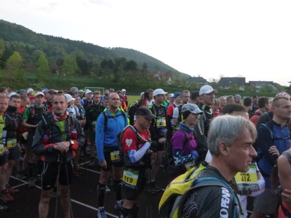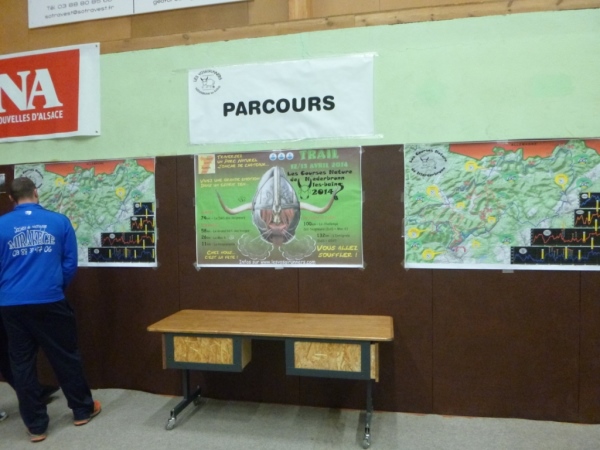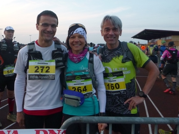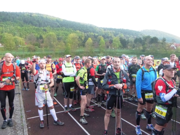 In der Sporthalle des Gymnasiums Mont Rouge konnten die knapp 300 Starter bereits freitags und samstags ihre Startunterlagen abholen, Nachmeldungen für den Défi des Seigneurs waren leider nicht möglich. Außerdem musste jeder Starter ein gültiges, max. ein Jahr altes, ärztliches Attest vorgelegen. Zu jeder Startnummer gehörte neben einer Flasche Cuvée des Châteaux (eine Flasche Pinot Blanc) auch ein laminiertes Streckenprofil (Teil der Pflichtausrüstung). Allmählich versammelten sich die Läufer mit kompletter Trailausrüstung in der Sporthalle beim Paul Weber-Stadion, um sich dann kurz vor 7 Uhr ins Stadion zum Start zu begeben. Draußen war es bereits hell, ein angenehmer Morgen mit viel Sonnenschein, blauem Himmel und angenehmen Temperaturen. Nach einem kurzen Briefing durch den Veranstalter, auch auf Deutsch, wurden wir pünktlich um 7 Uhr auf unseren Weg geschickt, zuerst 300 m auf der Stadionbahn und dann gleich bergauf in den angrenzenden Wald.