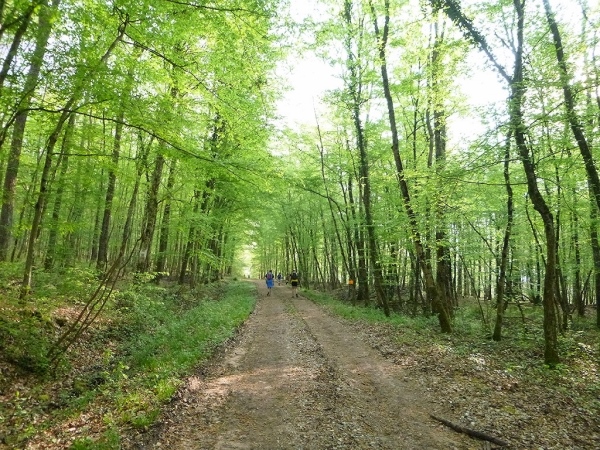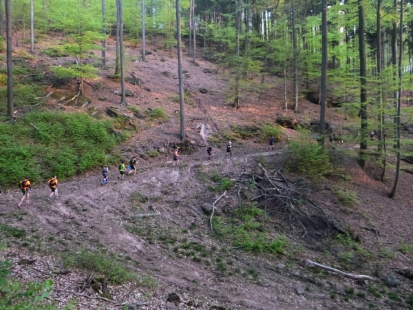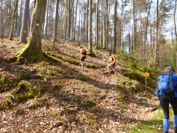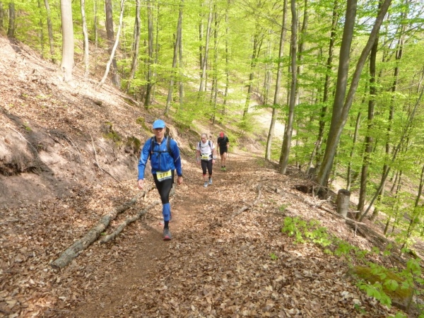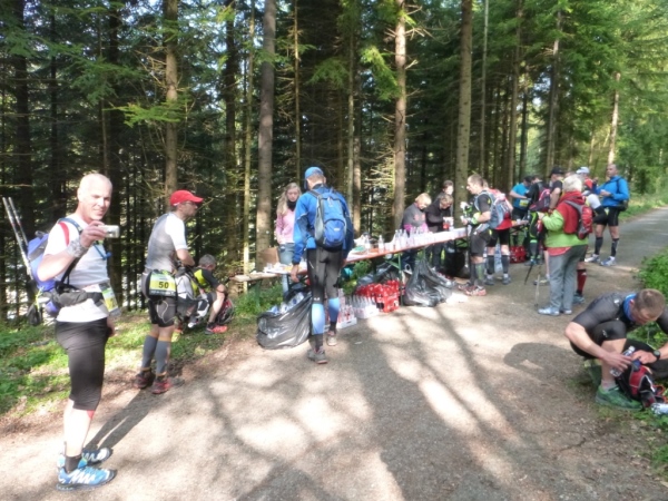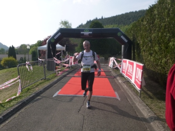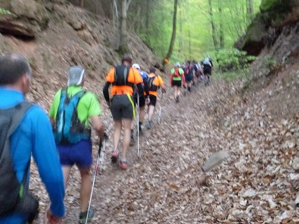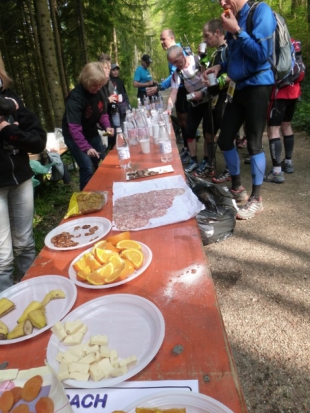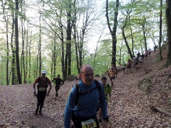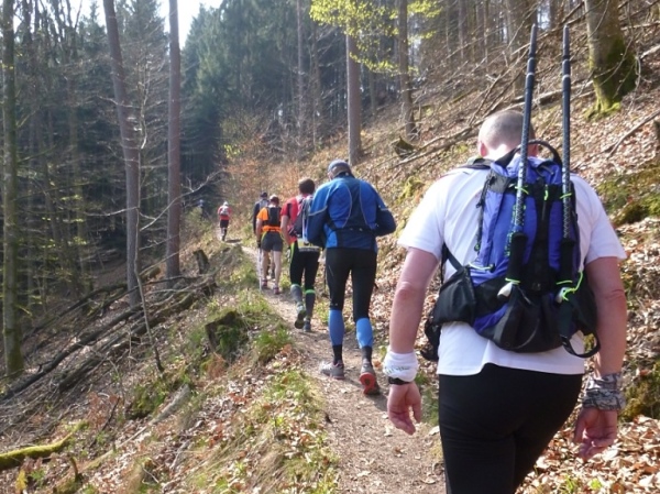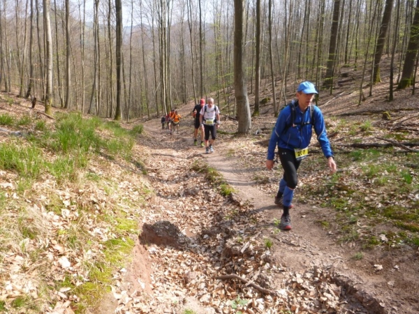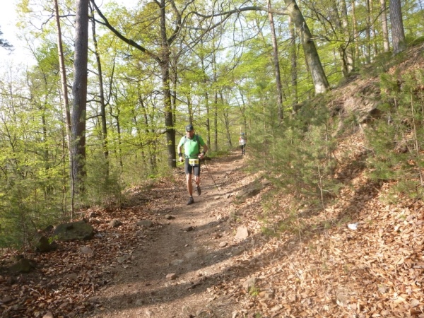 Allerdings gab es nur wenige Aussichtpunkte, wo wir zwischen den Bäumen hindurch die Landschaft sehen konnten. Selbst auf den Grand Wintersberg standen wir auf einer kleinen Lichtung von Bäumen umringt. Den Aussichtsturm auf dem Berggipfel wollten wir nach so vielen Kilometer nun auch nicht mehr besteigen! Weite Streckenabschnitte führten durch lichte Buchenwälder, die durch die Frühlingssonne mit Lichtstrahlen durchflutet wurden. Mit vier Verpflegungsstellen hatten wir auf der Strecke in angenehmen Abständen die Möglichkeit, unsere Speicher und unsere Trinkvorräte zu füllen. Eine Ergebnisliste zum Défi des Seigneurs konnte ich im Internet finden, leider nur nach der Gesamtplatzierung sortiert, was eine Analyse sehr mühsam macht. So verzichtete ich auch auf eine Auswertung, denn bei so einem Wettkampf in der Natur steht das verletzungsfreie Durchkommen im Vordergrund.