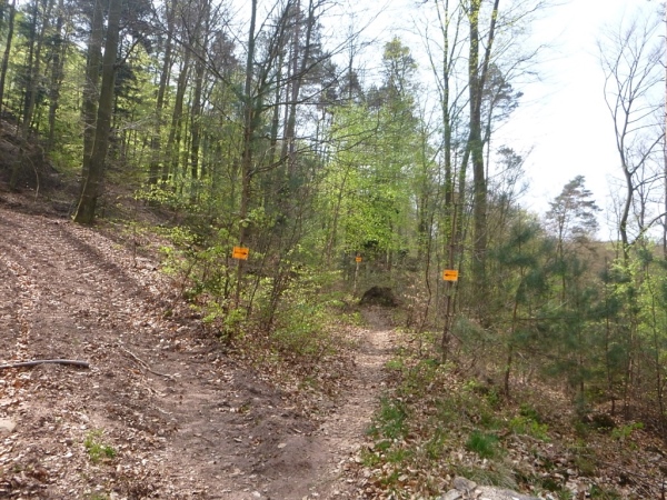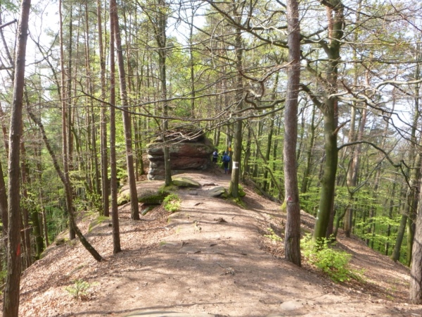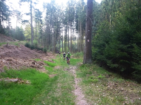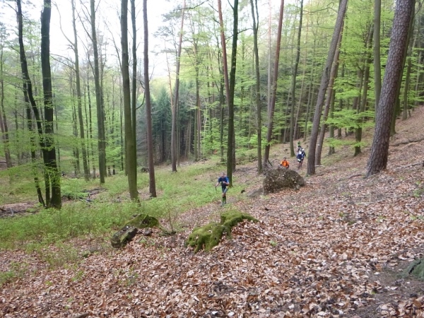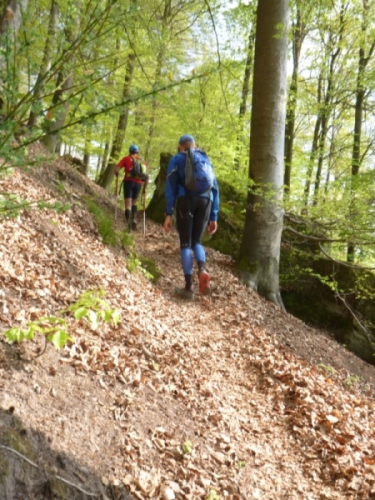 Die ersten acht Kilometer wechselten zwischen breiten Waldwegen und schmalen Pfaden durch den lichten Buchenwald in harmonischem Wechsel bergauf und bergab. Bis nach Jägerthal (km 8) konnten wir uns so perfekt auf den Laufuntergrund einstellen. Die breiten Wege und Trails waren oft sehr sandig und durch die Buntsandsteinfelsen meist rötlich gefärbt. Durch den mangelnden Regen der letzten Wochen wurde dieser feine Sand immer wieder durch die Voranlaufenden aufgewirbelt, so dass wir häufig in eine Staubwolke gehüllt waren.