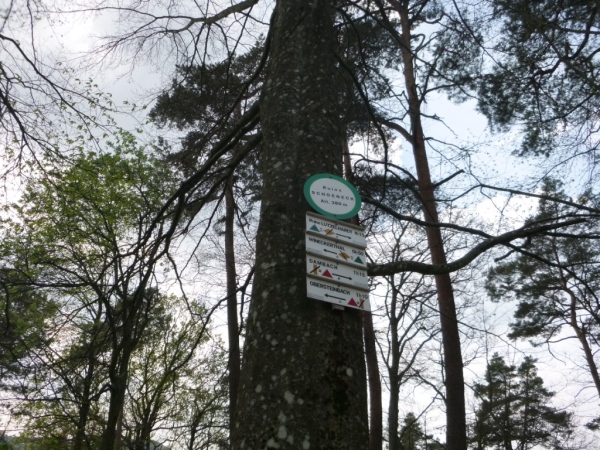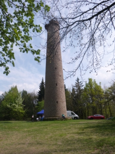 Auf den folgenden 10 Kilometern ging es dann überwiegend im Wald in einer großen Schleife zum 581 m hohen Grand Winterberg, der höchsten Erhebung in den Nordvogesen. Noch einmal kamen wir an einer Ruine, der Burg Hohenfels, vorbei. Abwechselnd auf breiten Waldautobahnen und schmalen Trails liefen wir bergauf und bergab zum Gipfel des Grand Wintersberg. Direkt neben dem Aussichtsturm war die vierte und letzte VP bei km 66 (Zeitlimit 11:50 Stunden) aufgebaut. Ein Schild mit der Aufschrift „nur noch 9 Kilometer“ versicherte uns, dass das Ziel in Niederbronn nicht mehr weit war. Allerdings ging es von hier aus nicht auf kürzestem Weg ins Ziel, wir befanden uns erneut auf wunderschön zu laufenden Trails im schattigen Wald. Auch wenn die Beine nach den vielen Kilometern bereits müde waren, machte uns hier das Laufen wieder richtig Spaß. Da die welligen Trails kaum noch Steigungen aufwiesen, konnten wir wieder richtig Tempo aufnehmen.