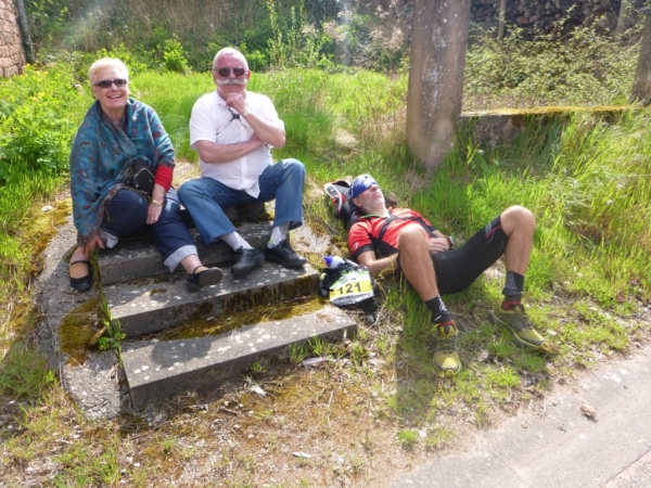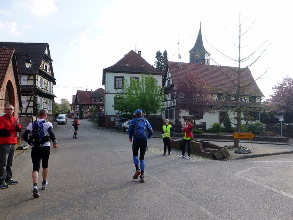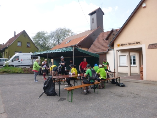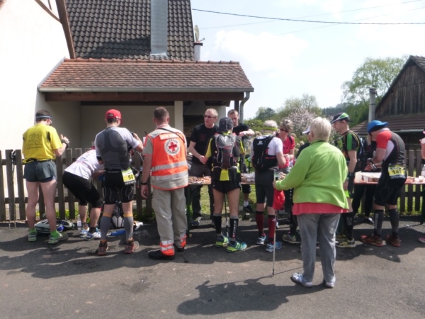 Bis zur dritten VP in Dambach (km 56 / Zeitlimit 9:30 Stunden) mussten wir nur etwa 12 Kilometer laufen, allerdings mit steilen Anstiegen versehen, einmal hinauf zum Col du Langenthal, dann zum Schloss Schoeneck und schließlich zum Modenberg, wo ein steiler Pfad entlang einer Felsenwand in steilem Zickzack hinunter nach Dambach führte. Am Schwarzbach-Ufer entlang liefen wir über einen schönen Wiesenweg bis in die Ortsmitte. Hier begrüßte uns erneut eine große Bunkeranlage, dieses Mal mitten im Ort und direkt neben der Kirche – eine eigenartige Kombination! Doch unsere Aufmerksamkeit galt mehr dem Buffet mit Wasser, Cola, frischem Obst, getrockneten Pflaumen, Rosinen, Schokoriegel, Salzbrezeln, Käse und Wurst, das uns die freundlichen Helfer auftischten.
