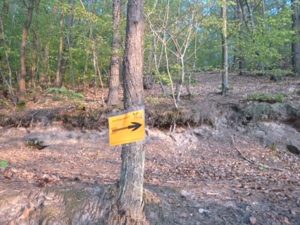 Manchmal mussten wir auf den schmalen Pfaden hervorstehende Wurzeln oder kleine Felsen überwinden, aber meistens gestaltete sich der Untergrund auf der gesamten Strecke als nicht besonders schwierig. Die Strecke war perfekt markiert, teils fanden sich leuchtend gelbe Schilder mit der Aufschrift „Defi des Vosges“ oder organefarbene mit großem Pfeil und dem Emblem der Vosgirunners, dem Highland Cattle. Zusätzlich sorgten Sägemehllinien an Abzweigungen für Sicherheit und an den Straßen waren jeweils Streckenposten positioniert, die für eine sichere Überquerung der Straße sorgten. Kilometermarkierungen gab es auf der gesamten Stecke keine, einzig an den vier Verpflegungsposten war ein Hinweisschild mit Ortsbezeichnung und Kilometerangabe zu finden.