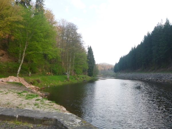 Hinter Lembach konnten wir uns auf einen wunderschönen Streckenabschnitt freuen, denn nun sorgten die angekündigten Felsenburgen und die vielen Buntsandsteinfelsen, die im Wald versteckt waren, für reichlich Abwechslung auf der Laufstrecke. Besonders beeindruckend waren die perfekt in die Felsen gebauten, mittelalterlichen Burgen, die mit den Felstürmen mächtig zwischen den Bäumen emporragten. Nach der Burg Fleckenstein (km 34) ging es erst einmal bergab zur Sauer bei Hirschthal, das sich bereits auf deutscher Seite befindet. Unsere Strecke blieb jedoch auf französischem Gebiet und führte entlang des Grenzverlaufs weiter zur Froensbourg (km 37) und über den Falkenberg zur Burg Wasigenstein (km 42). Nur noch zwei Kilometer trennten uns von der zweiten VP in Obersteinbach (km 44 / Zeitlimit 7:35 Stunden), wo wir unsere Trinkblasen mit frischem Wasser auffüllten. Es war bereits Mittagszeit und die Frühlingssonne wärmte schon ganz kräftig, so dass wir uns über jedes schattige, kühle Wegstück freuten.