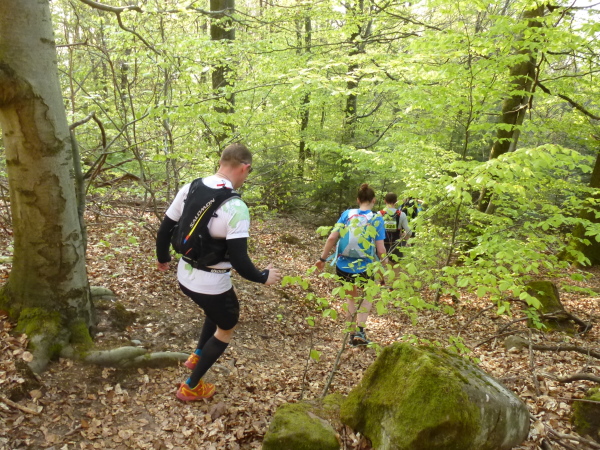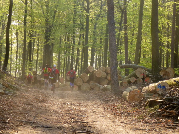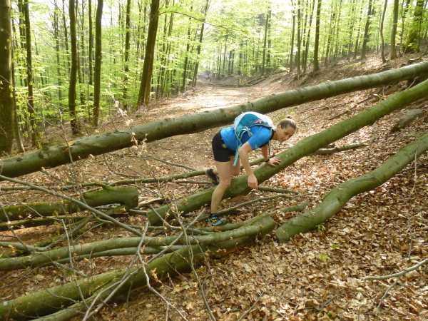 Dann laufen wir auf dem bisher meiner Meinung nach einzigen nicht so spannenden Streckenabschnitt ein paar Kilometer auf breiten Waldwegen. Dieser Bereich ist normalerweise recht ereignislos. Doch dieses Mal ist er mit einem herrlichen Hindernis-Parcours garniert. Auf einigen hundert Metern liegen sehr viele gefällte Bäume über den Weg. An manchen Stellen liegt das Gehölz so dicht, dass man unmöglich drüber steigen kann und sich einen Weg oberhalb am Steilhang suchen muss. An anderen Stellen kraxelt man über die Stämme oder kriecht unter ihnen durch. Welch ein Spaß!Diese grandiose Streckenverbesserung begeistert mich. Von mir aus könnte man Holzfällarbeiten zum festen Bestandteil der Vorbereitung von Lauf-Veranstaltungen machen.