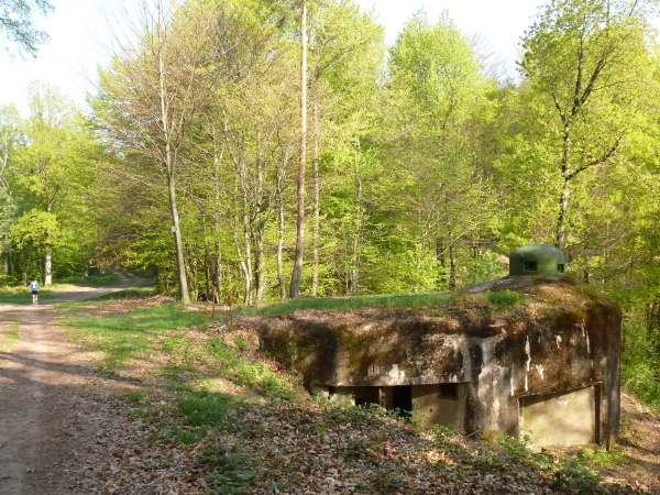 Den ganzen Tag über wechseln wir häufig zwischen breiten, bequemen Waldwegen und nicht allzu schweren Single-Trails. Bergauf dominieren flache Aufstiege, bergab geht es oft recht rasant über steile Pfade. Bei Jaegerthal kommen wir an der Ruine einer alten Eisenschmiede vorbei. Schon 1890 endete die Zeit dieser Schmieden. Danach folgt ein Aufstieg durch ein schönes Tal, anschließend geht es ordentlich bergauf. Im Wald treffen wir mehrmals auf kleine Bunker. Diese zählen zur Ligne Maginot, einer 1930-1940 erbauten Kette von Bunkern und anderen Verteidigungsanlagen, die damals die Grenzen Frankreichs schützen sollte.