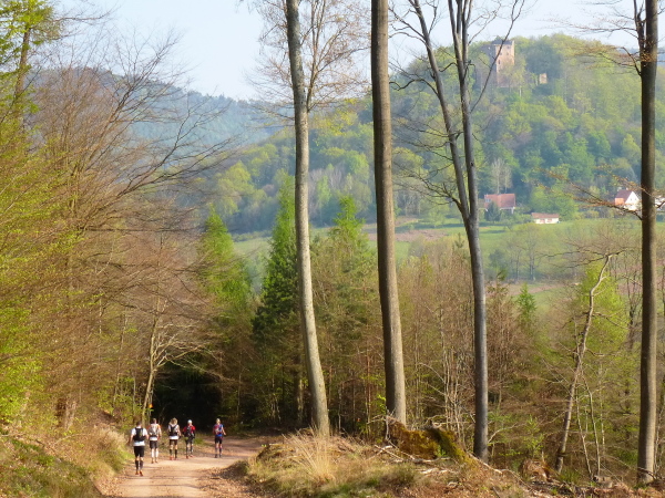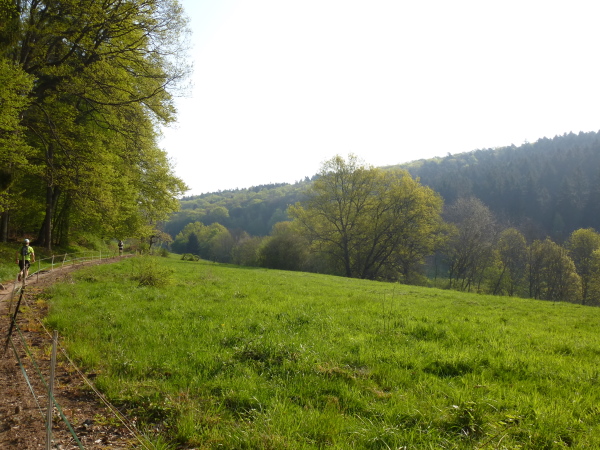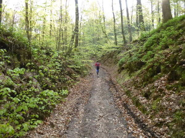 Doch eigentlich genügt mir schon die idyllische Natur zum Glücklichsein. Heute laufen wir fast ausschließlich durch den Wald des von der UNESCO geschützten, grenzüberschreitenden Biosphärenreservat Nordvogesen / Pfälzerwald. Nur selten sehen wir Häuser oder Straßen. Unser Weg führt meist durch hellen Laubwald, vereinzelt mit Kiefern dekoriert. Nur ab und zu geht es über Wiesen. Der Asphaltanteil ist minimal. Die Trails und Waldwege führen meist über bequem laufbaren Sandboden.