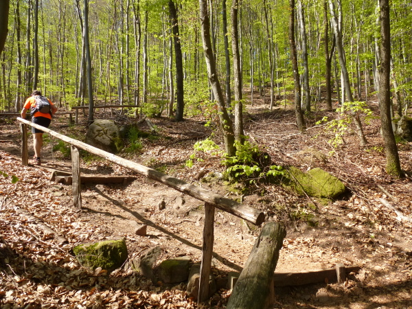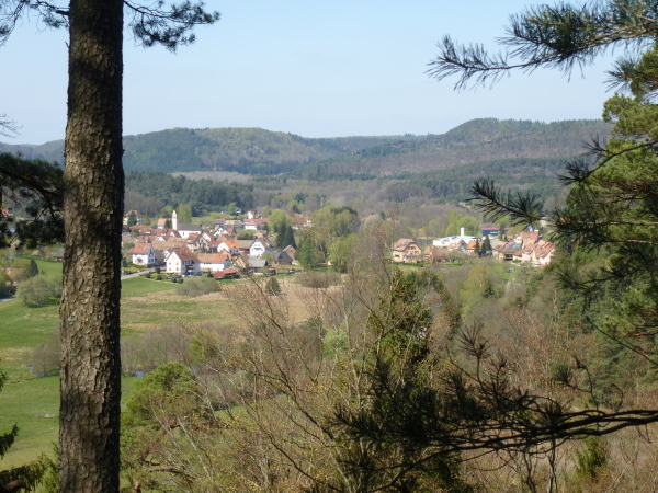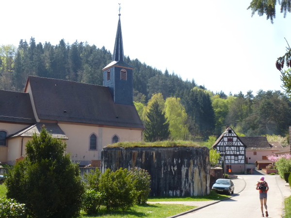 Ein weiterer anstrengender Aufstieg folgt. Nach viel auf und ab erreichen wir eine Gruppe großer Felsen, an denen wir entlang laufen, dann führt ein toller Single-Trail steil bergab. Wenig später laufen wir neben einem idyllischen Bach zum kleinen Dorf Dambach. Neben der Kirche sehen wir ein weiteres Befestigungswerk der Magniot-Linie.