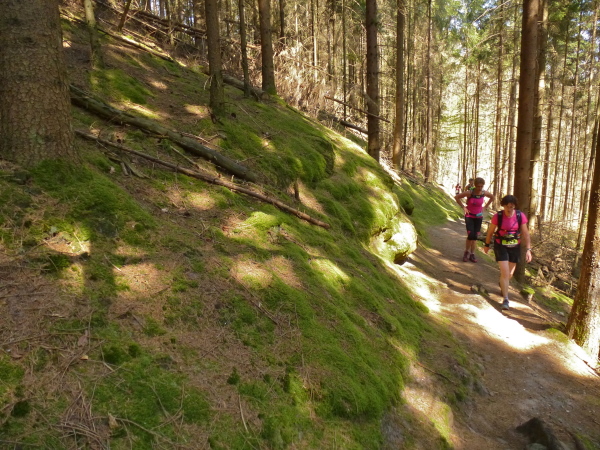 Weiter geht es auf wunderschönen Trails. Ich laufe tausend Mal lieber auf Trails statt auf flachen, asphaltierten Strecken. Bei Trailrunning liebe ich das je nach Steigung oder Gefälle häufig wechselnde Tempo, mal steil bergauf marschieren, mal wie ein Irrer ungebremst steile Pfade hinab sausen. Auf Trails gibt es kein simples Voranlaufen im "Autopilot-Modus". Steine, Wurzeln und andere Unebenheiten erfordern stets Aufmerksamkeit. Man kann auf Trails nicht einfach monoton und gedankenlos voran traben, sondern setzt sich pausenlos mit der Natur unter den Füßen auseinander.