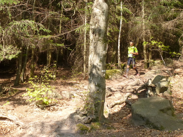 Dann eile ich auf einem wirklich rasanten Downhill-Trail in die Tiefe. Erst weiter unten, beim Parkplatz am Chateau Wintersberg, wechselt dieser Kamikaze-Spaß wieder zu leichterem Trailrunning, bevor unser Abstieg noch einmal durch einige positive Höhenmeter unterbrochen wird. Ein weiterer kurzer Downhill, ein bequemer Gegenanstieg dann wieder schnell bergab. Nach 8:05 Stunden erreiche ich als 138 von 189 Finishern das Ziel. Ich bin zufrieden, zumal ich diesen schönen Trail heute ja nicht als Wettkampf betrachte, sondern als Trainingseinheit laufen wollte. Mit Rüdi und Hans, zwei Lauffreunden, mit denen ich hier hergefahren bin, rede ich über meine Idee, diese Reportage "Trailrunning für Anfänger" zu nennen. Technisch schwere Trails gibt es auf dieser Strecke keine. Doch die beiden überzeugen mich, dass manche steile Abstiege dennoch für Anfänger eine ordentliche Herausforderung sein können. Verglichen mit einem klassischen deutschen Landschaftsmarathon sind diese Pfade anspruchsvoll. Im Vergleich zu alpinen Trails oder manch anderen Strecken in den Vogesen eignet sich Niederbronn aber durchaus als Einstieg.