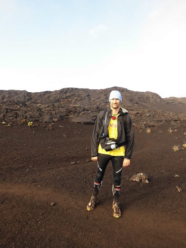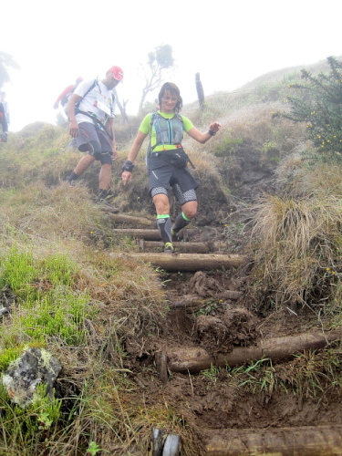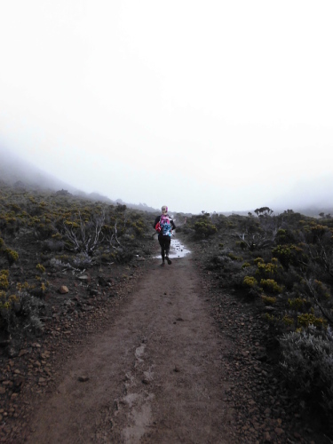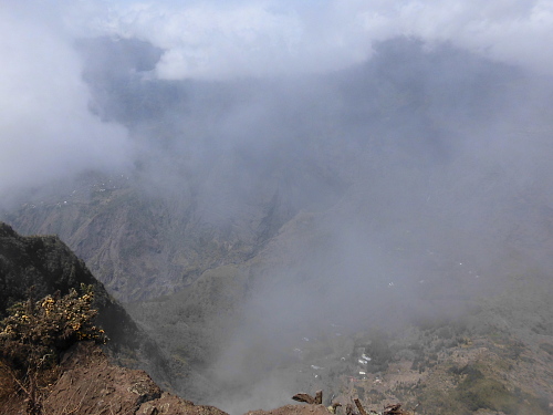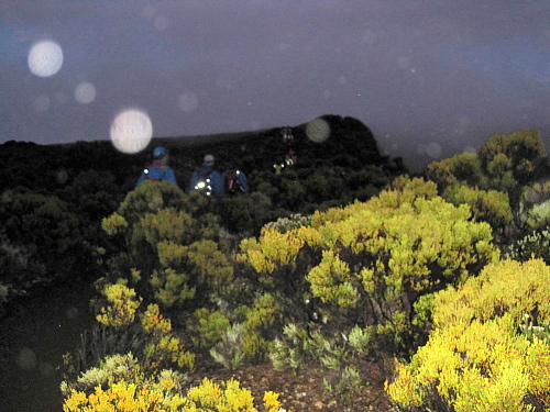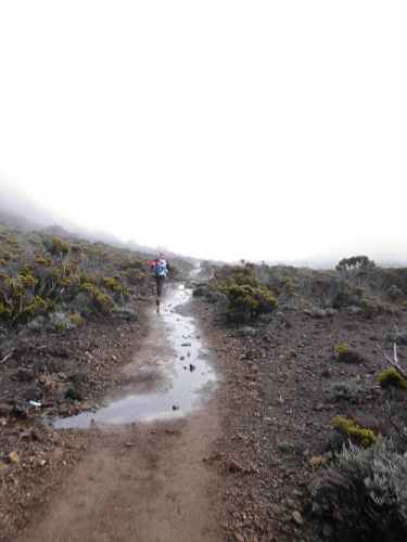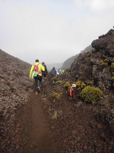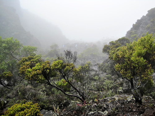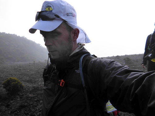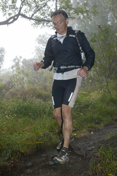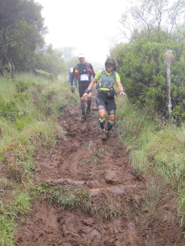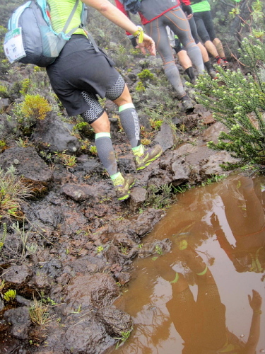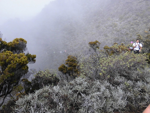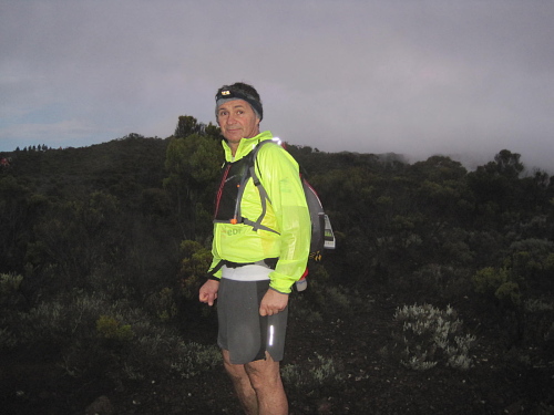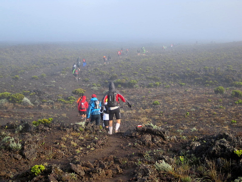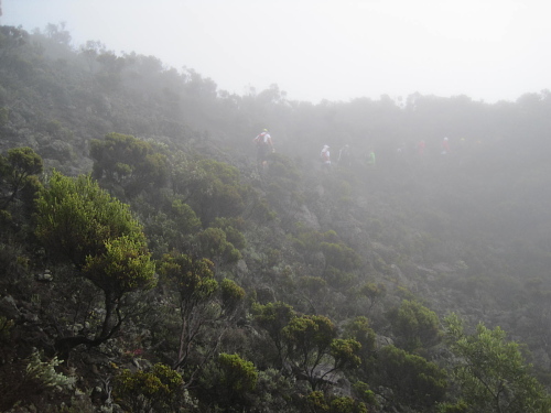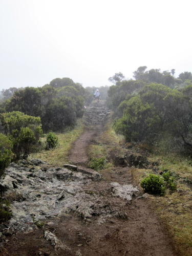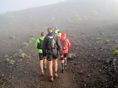 Oben angekommen, glauben wir mit dem längsten Anstieg das Schlimmste erst einmal überstanden zu haben. Ein schwerer Irrtum, wie sich alsbald herausstellen sollte. Das wahre Laufabenteuer erwartete uns noch. Auf dem Vulkan war ist es nasskalt und zugig. Also sofort weiter und weg aus dieser ungastlichen Umgebung. Die exotische Kulisse ist im Nebel nur schemenhaft zu erahnen, bei Tag und bei Sonnenschein sicherlich ein traumhaftes Erlebnis. Diese gespenstische Landschaft bleibt wohl für immer in Erinnerung.