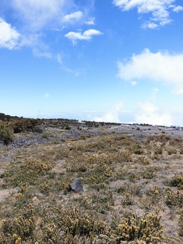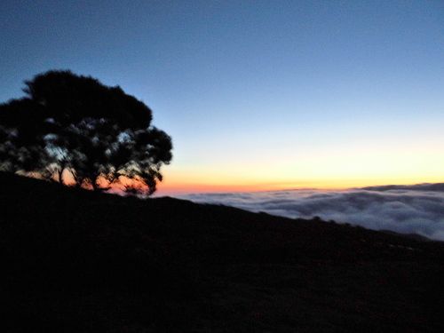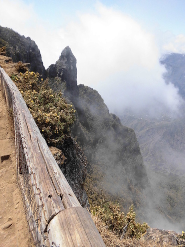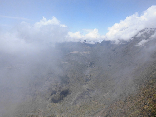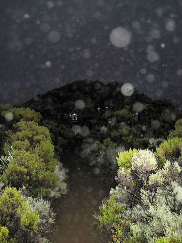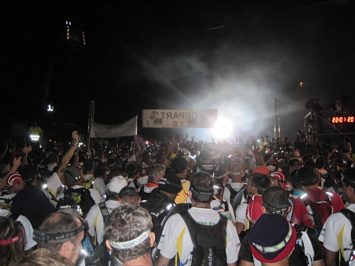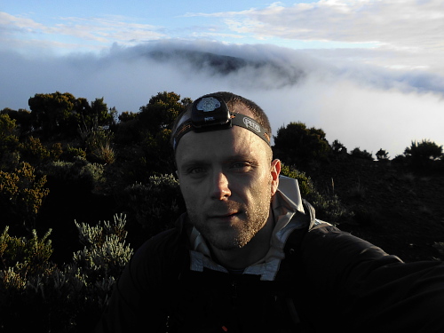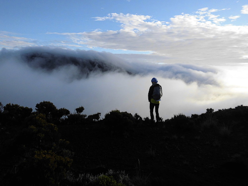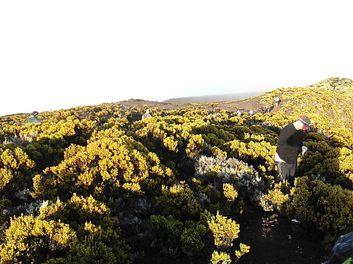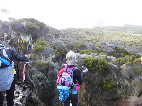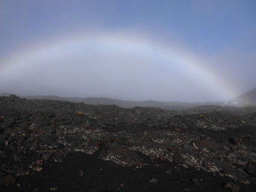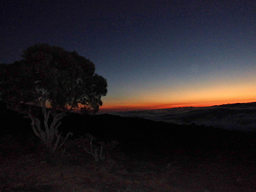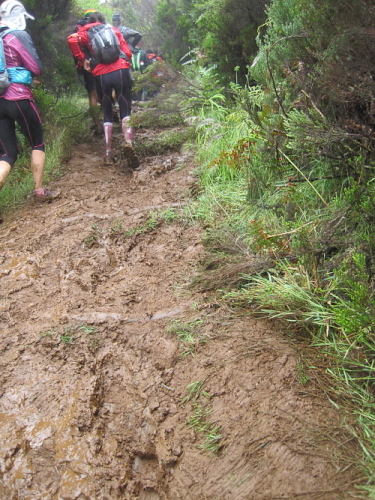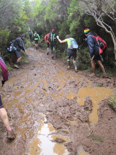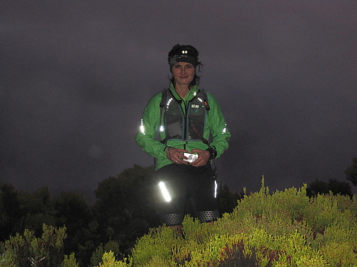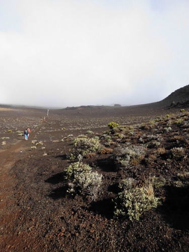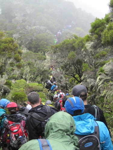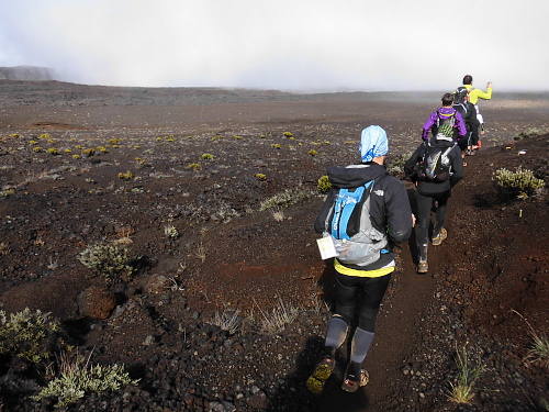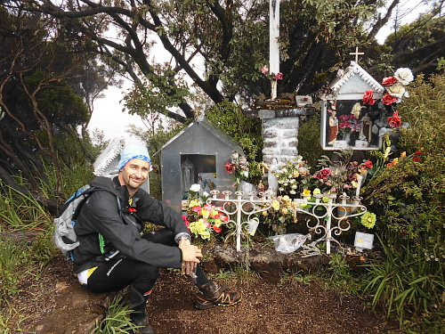 Oben angekommen, glauben wir mit dem längsten Anstieg das Schlimmste erst einmal überstanden zu haben. Ein schwerer Irrtum, wie sich alsbald herausstellen sollte. Das wahre Laufabenteuer erwartete uns noch. Auf dem Vulkan war ist es nasskalt und zugig. Also sofort weiter und weg aus dieser ungastlichen Umgebung. Die exotische Kulisse ist im Nebel nur schemenhaft zu erahnen, bei Tag und bei Sonnenschein sicherlich ein traumhaftes Erlebnis. Diese gespenstische Landschaft bleibt wohl für immer in Erinnerung.