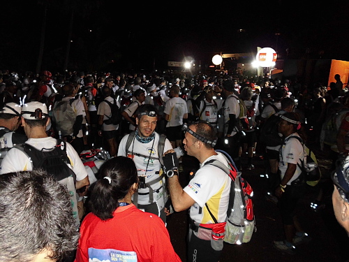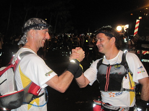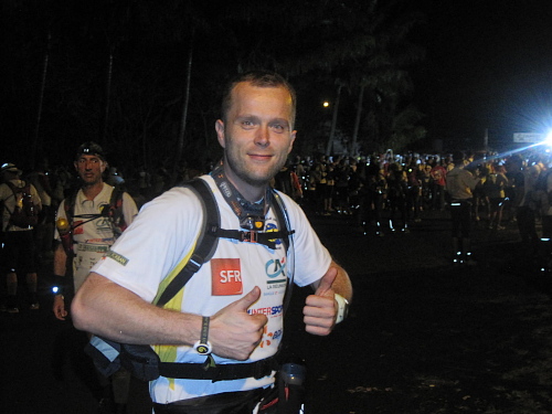 Hunderte Läuferinnen und Läufern schlafen am Wegrand auf Steinen oder im Gestrüpp, sitzend oder liegend, manchmal wie Gespenster aussehend eingehüllt in Überlebensdecken. Auch genehmige mir mehrere, teilweise sogar längere Schlafpausen. Die letzte bei La Possession an der Westküste der Insel, wo ich gnadenlos verschlafen hätte, wenn mich eine liebevolle Betreuerin nicht zur abgesprochenen Zeit erbarmungslos wieder auf die Strecke geschickt hätte.