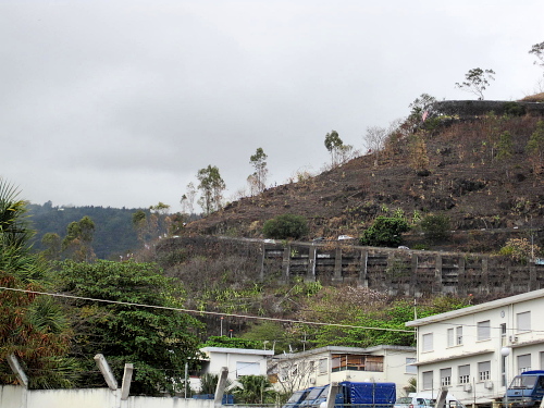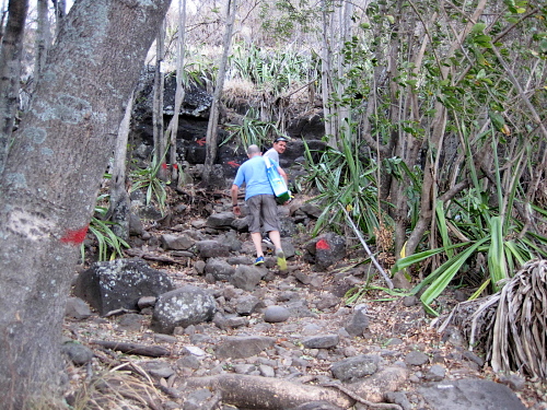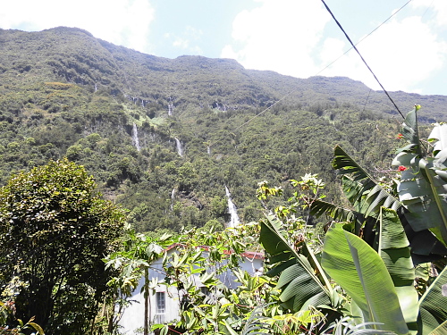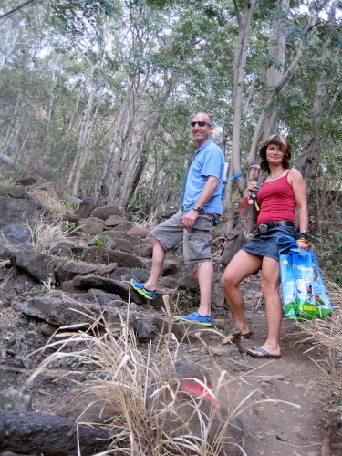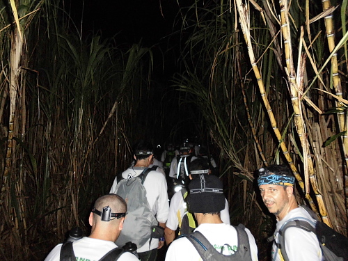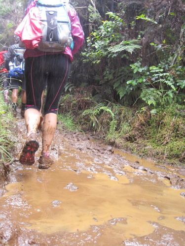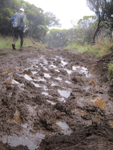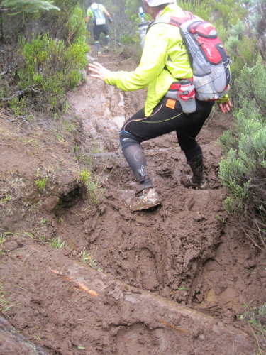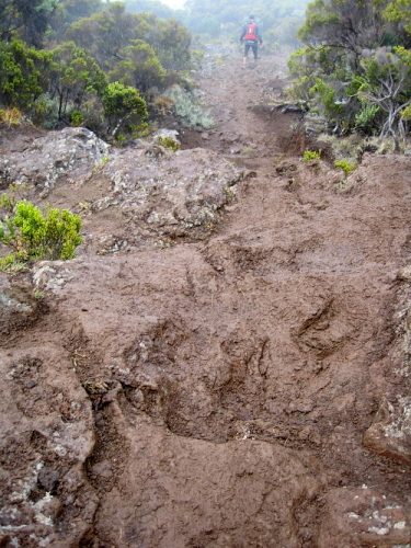 Nach dem Start erst einmal eine etwa 6 km lange Straße. Danach ein Abschnitt vorbei an Zuckerrohrfeldern auf meist gut ausgebauten Wirtschaftswegen. Nach etwa 20 km ändert sich die Situation schlagartig. Der Anstieg von Meereshöhe auf den 2.400m hoch gelegenen Vulkan fordert uns erstmals kräftig heraus. Es ist nicht nur der Höhenanstieg oder die Steilheit des Pfades. Es ist auch der schwierige Untergrund mit hohen Absätzen sowie der aufgeweichte und rutschige Boden. Just zum Start stellte sich nämlich durch den herannahenden Zyklon Dauerregen ein.