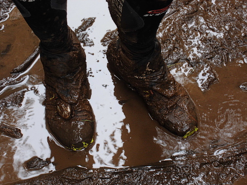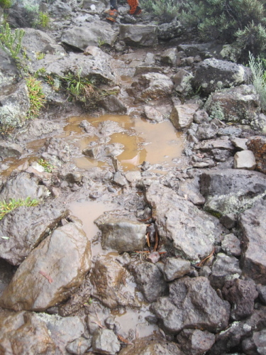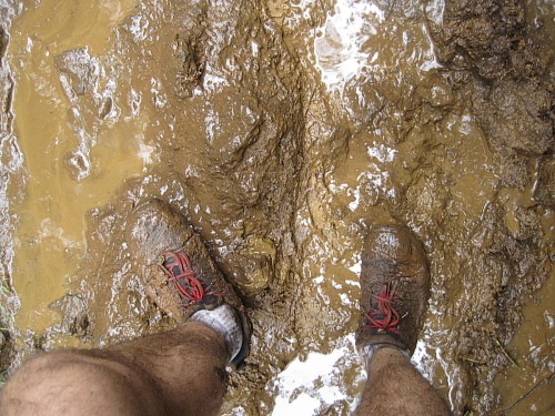 Je weiter man sich fortbewegt, je nasser, rutschiger und schlammiger werden die Wege. Ausweichversuche werden postwendend mit Ausrutschern quittiert. Ich glaube, nicht weniger als gutes halbes Dutzend Mal liege ich im Matsch. Irgendwann begreife ich, ausweichen ist hier völlig zwecklos, du musst da einfach durch, auch wenn der Schlamm manchmal bis über die Waden reicht. Nur die Wegmitte ist steinig und damit meist griffig.